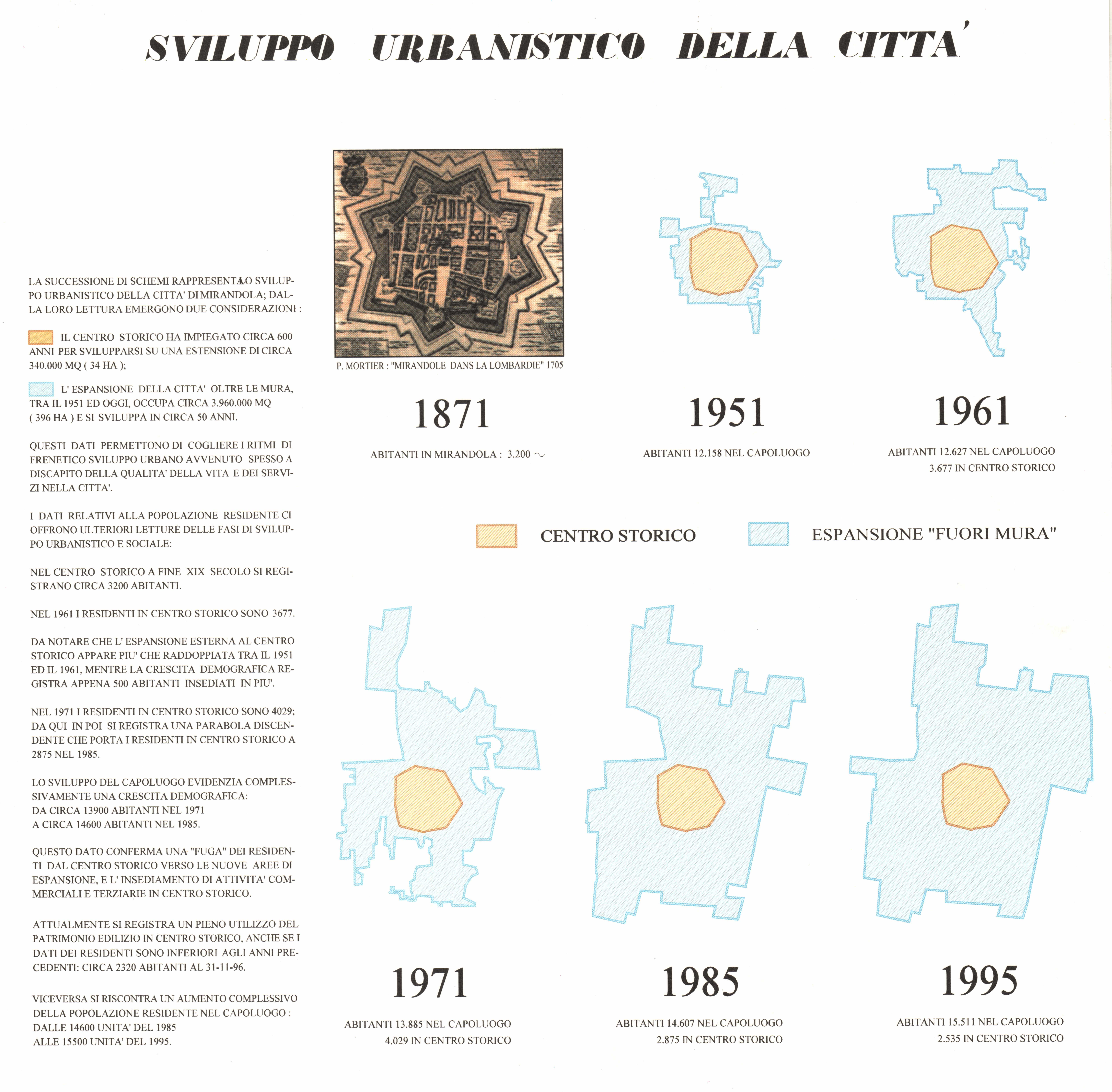 La successione di schemi rappresenta lo sviluppo urbanistico della Città di Mirandola: dalla loro lettura emergono due considerazioni.