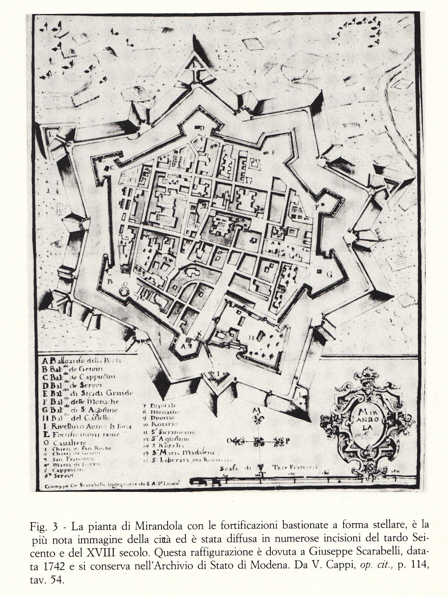 Le fortificazioni a pianta stellare, tipiche delle piazzeforti della matura epoca cinquecentesca, dando fama di fortezza imprendibile a Mirandola, contribuirono a renderne noto l’aspetto attraverso la divulgazione di incisioni particolarmente diffuse tra la fine del XVII secolo e il XVIII.