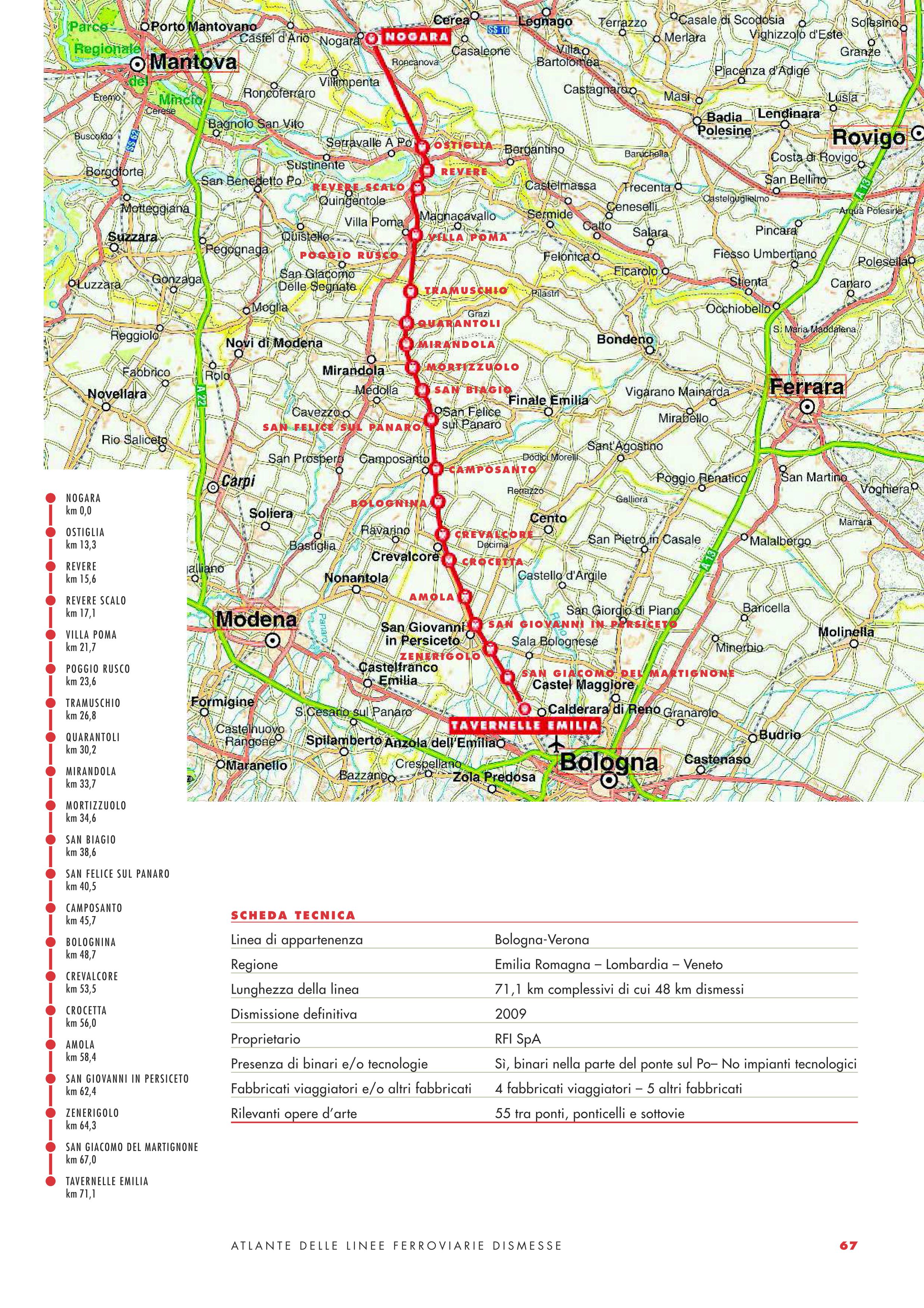 Con l’entrata in esercizio delle nuove varianti di tracciato, sono stati dismessi alcuni tratti di sedime della vecchia linea a singolo binario, per un totale di circa 50 km, ricadenti nel tratto Tavernelle Ostiglia-Nogara. Su questi tratti di sedime è stata asportata l’infrastruttura ferroviaria (tranne che nella parte del ponte sul Po). Sono presenti lungo il tracciato dismesso numerosi fabbricati, case cantoniere e ponti. Un primo tratto di sedimi dismessi, nel territorio dell’Emilia Romagna, costituito dall’itinerario Posto Movimento Tavernelle Emilia-San Giovanni in Persiceto-Crevalcore-Mirandola, è stato oggetto di due Protocolli di Intesa sottoscritti da RFI, Province e Comuni interessati, che hanno portato nel 2010 alla cessione in comodato d’uso da parte di RFI alle Province di Modena e Bologna delle aree di sedime dismesse della linea BolognaVerona; era prevista inoltre la cessione in sub-comodato delle medesime aree ai Comuni interessati: Anzola dell’Emilia, Calderara di Reno, Crevalcore, Sala Bolognese, Sant’Agata Bolognese, San Felice sul Panaro, San Giovanni in Persiceto, Camposanto, Mirandola e San Felice sul Panaro.
