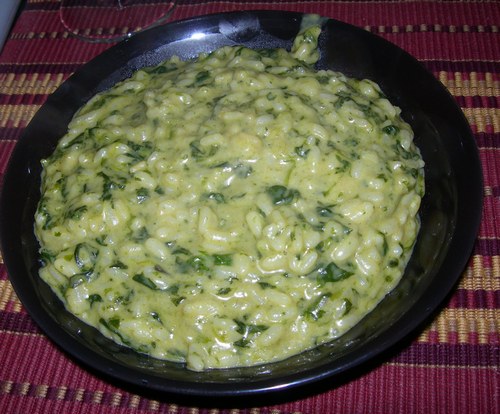 Impastando l’uovo e il Parmigiano-Reggiano grattugiato con i rebbi di una forchetta, si ottiene la tridùra, un condimento semplice ma saporito che può essere utilizzato in abbinamento a molte minestre. Nei risotti può andare assieme ad altri ingredienti (come gli spinaci di questa ricetta) ma è gradito anche da solo.