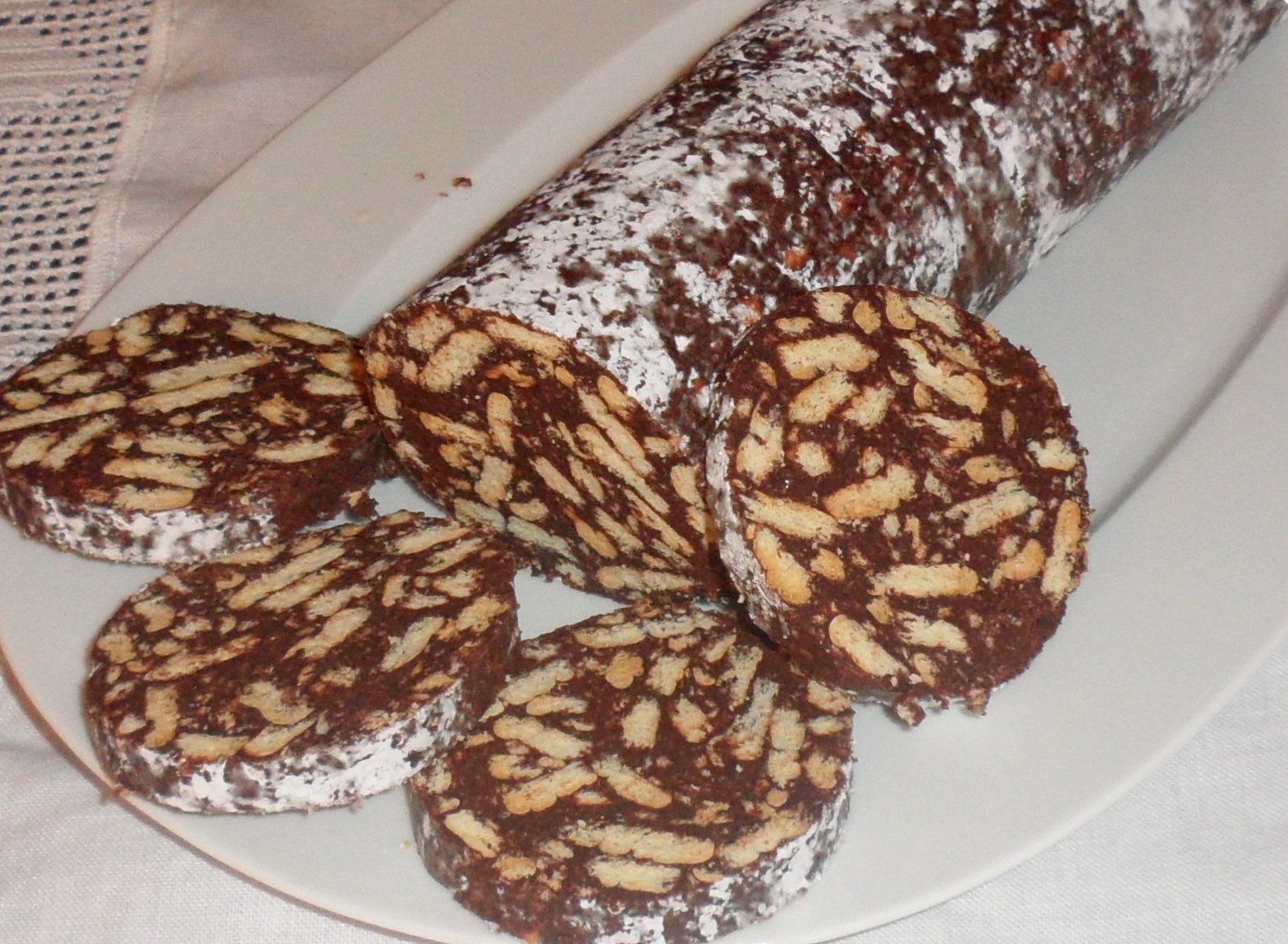 Tritate finemente il cioccolato fondente, i biscotti secchi e le mandorle, dopo che saranno state tostate. Ammorbidite il burro poi, in una teglia di ceramica, unite tutti gli ingredienti e, una volta ottenuto un impasto omogeneo, mettetelo in frigorifero per farlo indurire. Dopo alcune ore formate due salamini, poneteli su carta stagnola e ricopriteli di cacao in polvere. Ognuno dei due salami dovrà essere avvolto in carta stagnola e posto al fresco per indurire. Il salame di cioccolato va servito tagliato a fettine di mezzo centimetro di spessore. Naturalmente va accompagnato con il latte caldo, se si preferisce tagliato con il caffè o con le polveri di cioccolato, oppure anche con del thè al limone lasciato intiepidire.