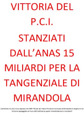 Per capire come mai mancava ancora la tangenziale sulla SS12, bisogna fare un passo indietro al 1989 quando l’UNITA’ pubblicava: Vittoria del PCI, stanziati dall’ANAS 15 miliardi per la tangenziale di Mirandola, e qui in centro alla nostra città di fronte al Municipio, rimase esposto un cartellone alto circa 2 m e largo 1,5 per sei mesi che riportava a caratteri cubitali: VITTORIA DEL PCI, STANZIATI DALL’ANAS 15 MILIARDI PER LA TANGENZIALE DI MIRANDOLA ………….. . Dopo sei mesi quel cartellone fu tolto, e dopo circa un anno e mezzo, nel 1991 fu convocata da Maino Benatti segretario del PCI, una conferenza sulla viabilità di Mirandola in Sala Granda con assessore provinciale alla viabilità il quale parlò per più di un’ora senza mai dire nulla sulla nostra tangenziale, al che appena il pubblico potè intervenire alla prima domanda:” dove fossero finiti i 15 miliardi della nostra tangenziale?”. Risposta: “il progetto non era pronto…… e allora li abbiamo spesi in tangenziale a…….. Modena”