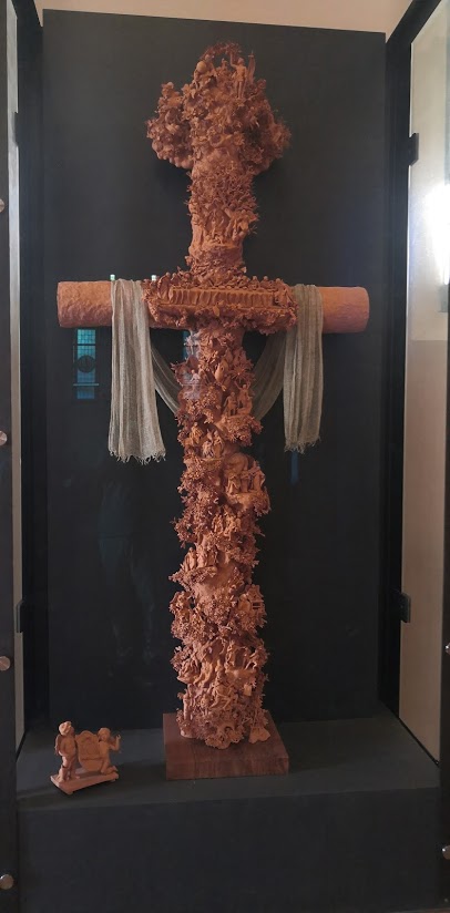 La scultura poggia alla base su un teschio da cui si sviluppa un albero abitato da varie specie di piccoli animali e insetti. Un tronco, ricco di fiori e di foglie, sembra quasi nascondere e sopraffare le arma Christi, l’insieme dei simboli che rappresentano la Passione di Gesù. Tra questi, una colonna, emblema della flagellazione, accoglie i segni dei “tradimenti”, quello di Giuda, con la borsa dei trenta denari, e quello di Pietro, con il gallo. Allo stesso tempo vi sono rappresentati i destini dei due apostoli, il cappio per Giuda, la chiave e la croce capovolta per Pietro. Poco più in alto sul teschio è raffigurata la Deposizione con putti.
