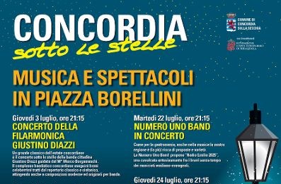 La rassegna Concordia sotto le stelle prevede un totale di 5 spettacoli in piazza Borellini nel mese di luglio. Il calendario completo degli eventi è disponibile sul sito del Comune: www.comune.concordia.mo.it.