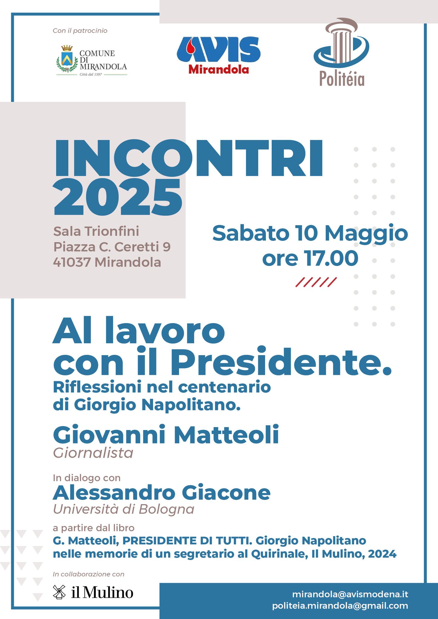 10 Maggio a Mirandola – AVIS Mirandola e Politeia – Al lavoro con il Presidente  – Riflessioni nel centenario di Giorgio Napolitano