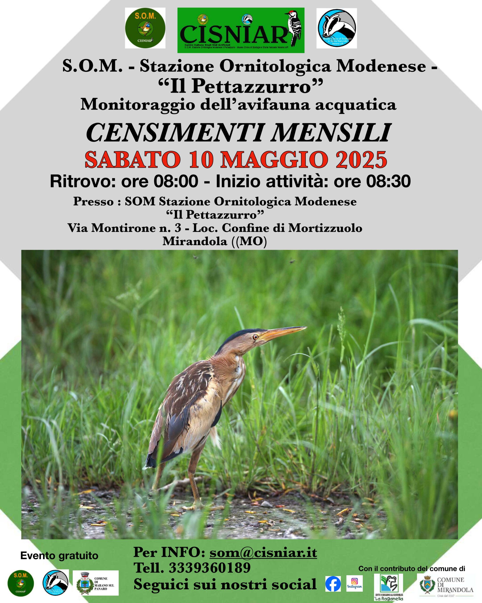 Censimenti mensili degli uccelli acquatici. Ci troviamo SABATO 10 maggio 2025 ALLE ORE 8:00 PRESSO LA SOM. Ritrovo ore 8:00, inizio ore 8:30 Verranno censite le zone umide della Bassa Modenese. Tutti sono ben accetti, i più esperti ma anche quelli alle prime armi o semplici interessati, si avrà l’opportunità di imparare tanto sull’identificazione degli uccelli, sul riconoscimento dei canti, sulle tecniche di censimento e si potranno scoprire queste meravigliose valli, tra le più ricche di avifauna dell’Emilia. Quale occasione migliore insomma per scoprire la vita delle nostre valli! Si raccomanda di portare un abbigliamento idoneo alla stagione, stivali di gomma e/o calzature impermeabili. |