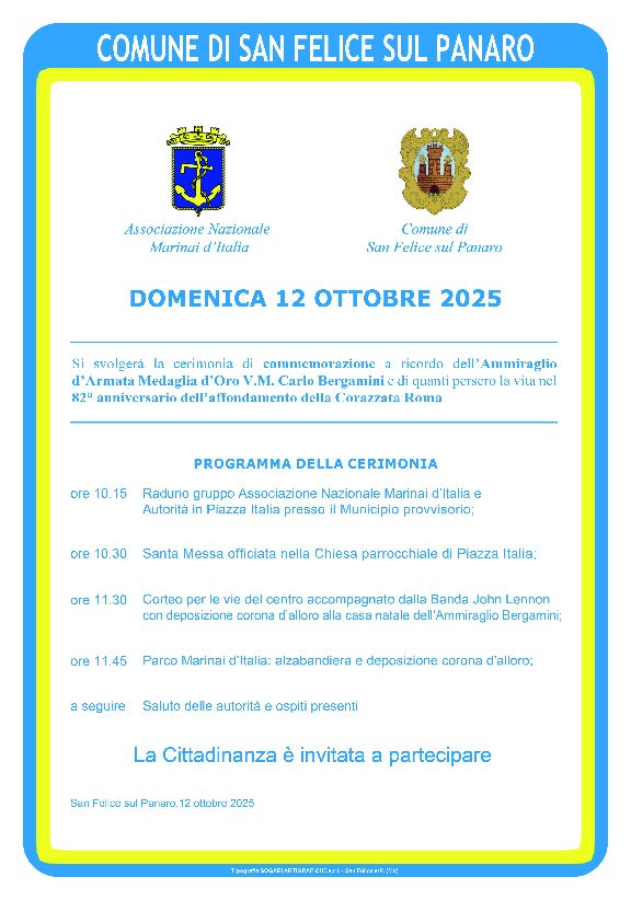 Domenica 12 ottobre a San Felice sul Panaro si svolgerà la cerimonia di commemorazione dell’ammiraglio d’armata, medaglia d’oro Carlo Bergamini e di quanti persero la vita nella ricorrenza dell’82°anniversario dell’affondamento della corazzata Roma.