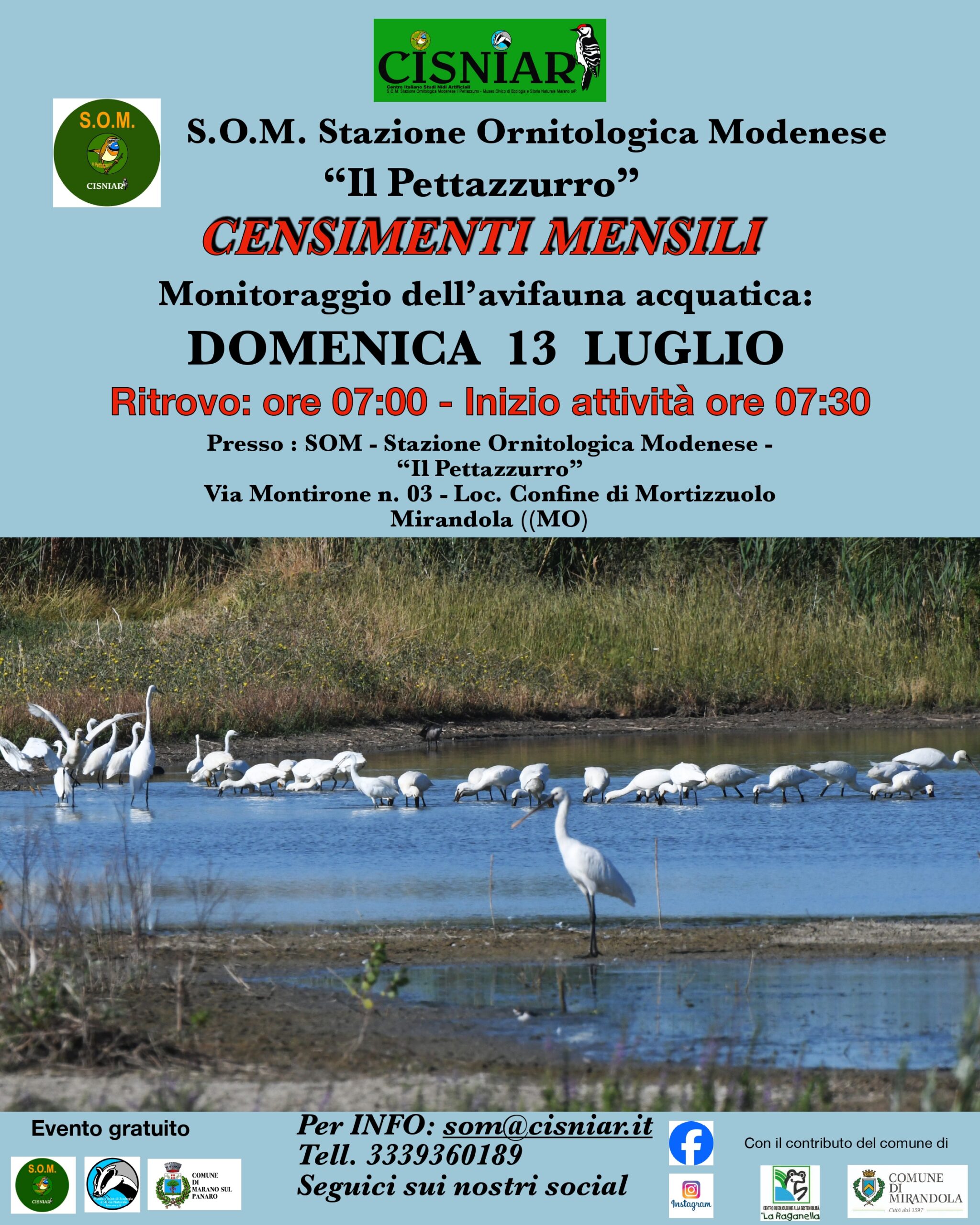 DOMENICA 13 Luglio 2025 ALLE ORE 7:00 PRESSO LA SOM. Ritrovo ore 7:00, inizio ore 7:30 Verranno censite le zone umide della Bassa Modenese. Tutti sono ben accetti, i più esperti ma anche quelli alle prime armi o semplici interessati, si avrà l’opportunità di imparare tanto sull’identificazione degli uccelli, sul riconoscimento dei canti, sulle tecniche di censimento e si potranno scoprire queste meravigliose valli, tra le più ricche di avifauna dell’EmiliaQuale occasione migliore insomma per scoprire la vita delle nostre valli!