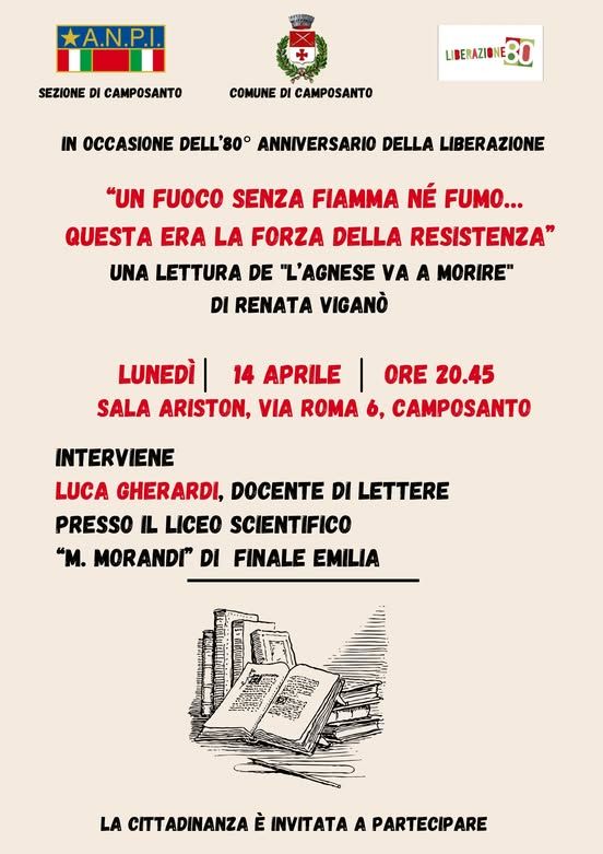 L’evento si terrà lunedì 14 aprile alle ore 20.45 presso la Sala Ariston, in via Roma 6 a Camposanto, e prevede una lettura e un approfondimento del romanzo “L’Agnese va a morire” di Renata Viganò, una delle opere più significative della letteratura resistenziale italiana.