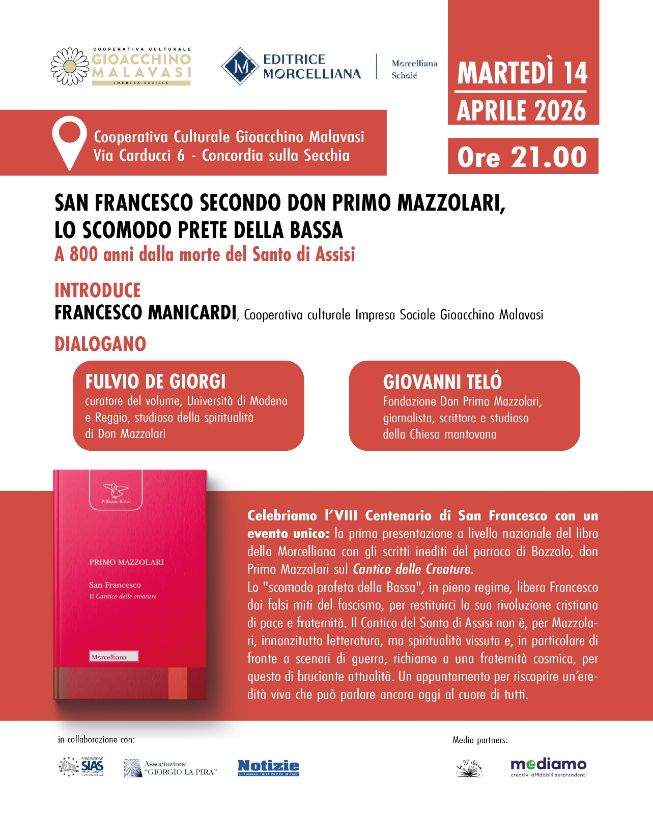 CONCORDIA SULLA SECCHIA (MO) – In occasione dell’VIII Centenario della morte di San Francesco, la Cooperativa Culturale Gioacchino Malavasi (Impresa Sociale) promuove un evento di eccezionale rilievo culturale e spirituale. Martedì 14 aprile 2026, alle ore 21, presso la sede di via Carducci 6 a Concordia sulla Secchia, si terrà l’incontro dal titolo: