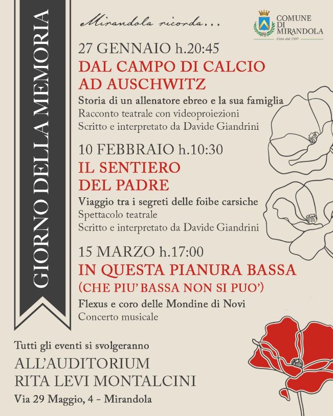 Con la rassegna “Mirandola Ricorda…” l’Amministrazione comunale rinnova il proprio impegno nella promozione della memoria storica come strumento di conoscenza, responsabilità e crescita civile, offrendo alla cittadinanza occasioni di riflessione condivisa attraverso linguaggi artistici accessibili e di grande valore culturale.