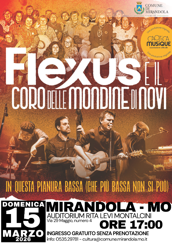 Sul palco la band Flexus, accompagnata dal numeroso Coro delle Mondine di Novi. “In questa pianura bassa” è il nuovo spettacolo che porta in scena le canzoni storiche delle due formazioni. I brani della monda si intrecciano con quelli dei Flexus, con alcuni omaggi ai grandi cantautori italiani, primo fra tutti Fabrizio De André, a cui Flexus e Mondine hanno dedicato uno spettacolo e un disco. Canzoni che raccontano la libertà dei popoli, il lavoro, la resistenza e i diritti, ma anche il rapporto con l’ambiente e con questa “terra bassa” profondamente legata al repertorio storico della risaia. Passato, presente e futuro si fondono così in una proposta artistica intensa e coinvolgente, capace di unire tradizione e innovazione.