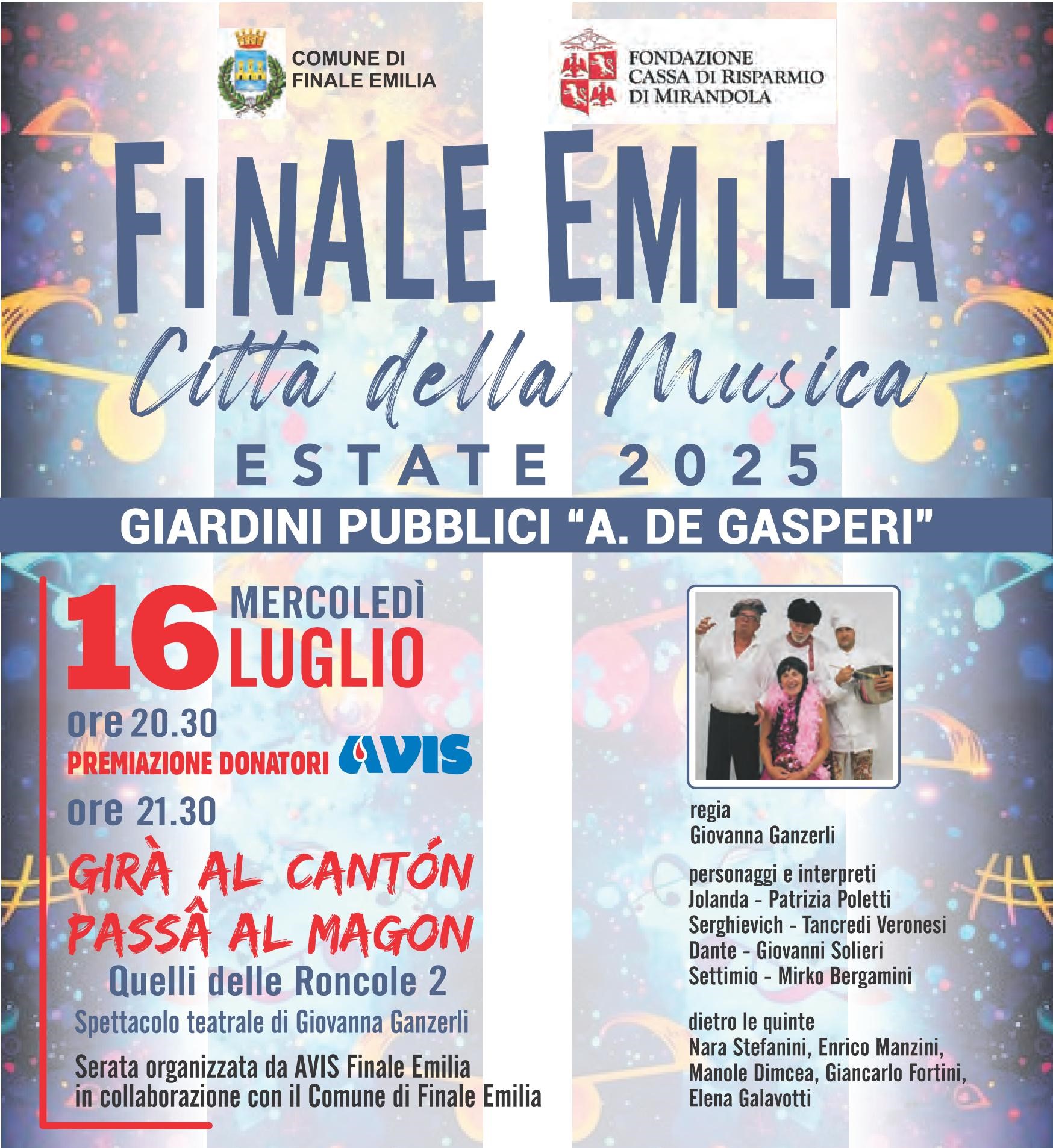 Il cartellone propone mercoledì 16 luglio, alle ore 20.30, l’appuntamento con la consueta premiazione annuale dei donatori Avis. La serata, organizzata dall’associazione Avis Finale Emilia in collaborazione con l’amministrazione comunale, proseguirà alle 21.30 con lo spettacolo di teatro dialettale “Girà al cantòn, passâ al magòn” con Quelli delle Roncole 2.
