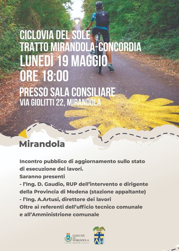 19 Maggio a Mirandola – Incontro pubblico di aggiornamento sulla Ciclovia del Sole Mirandola-Concordia