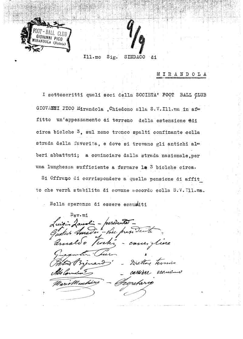 All’epoca nacque infatti un comitato provvisorio per la formazione di un “Foot-Ball Club Mirandolese” come lo chiamarono i nostri pionieri locali: Alberto Salieri, Luigi Zanoli, Arnaldo Vischi, Aldo Comini, Sergio Tabacchi e Mario Ceschi. Furono questi sei notabili che di fatto diedero il via alla pratica del calcio, domandando al Comune per giocare l’uso di un cortile dell’antico palazzo delle Scuole Comunali e di uno stanzino in esclusiva della palestra comunale dell’epoca per altre attività. Il sindaco, il giorno dopo, rispose subito affermativamente, concedendo gratuitamente gli spazi richiesti.