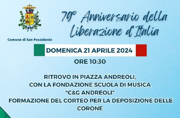 Ore 20.30 ritrovo in Piazza Don Andreoli. – Camminata per la resistenza – I ragazzi delle classi terze della Scuola secondaria di primo grado dell’Istituto Comprensivo S. Neri, si recheranno sui luoghi simbolo della Resistenza a San Possidonio, condividendo con gli intervenuti, il lavoro svolto nella realizzazione del progetto “La Scelta” a cura dell’Associazione Educamente. Saranno accompagnati dai ragazzi della Fondazione Scuola di Musica dell’UCMAN, diretti dal Maestro Enrico Malagoli. Seguirà saluto del Presidente dell’ANPI di San Possidonio che nell’occasione consegnerà ai ragazzi una copia della Costituzione Italiana.