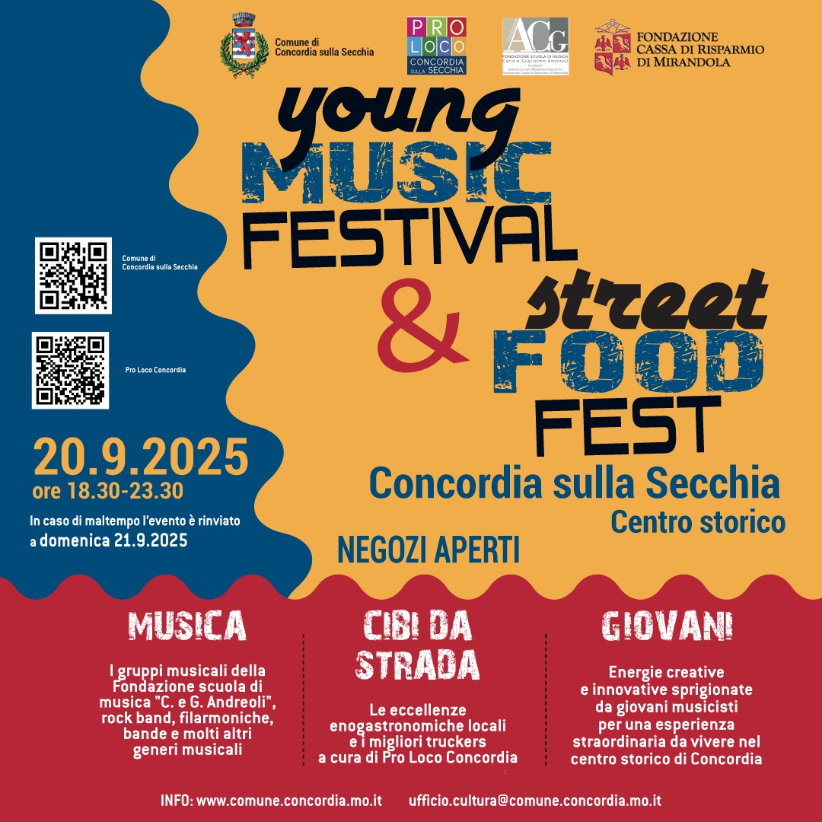 Sabato 20 settembre 2025 si tiene a Concordia lo Young music festival & Street Food Fest, l’evento che unisce il festival dei gruppi musicali giovanili della Fondazione Scuola di Musica Carlo & Guglielmo Andreoli al festival del cibo da strada gestito da Pro Loco Concordia. Musica, cibo e giovani sono gli ingredienti di una manifestazione unica nel suo genere che si sviluppa in tutto il centro storico di Concordia dalle 18.30 fino a sera.