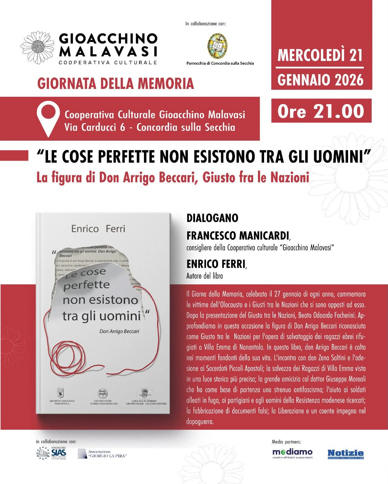 CONCORDIA SULLA SECCHIA (MO).  In avvicinamento alle celebrazioni per il Giorno della Memoria, la ricorrenza nazionale ed internazionale del 27 gennaio dedicata alle vittime della Shoah, la Cooperativa Culturale “Gioacchino Malavasi” – Impresa Sociale organizza una serata di approfondimento storico e civile dedicata a una delle figure più luminose della resistenza morale modenese: Don Arrigo Beccari.