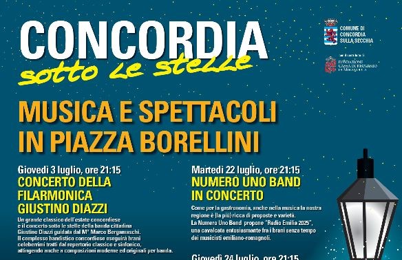 La rassegna Concordia sotto le stelle prevede un totale di 5 spettacoli in piazza Borellini nel mese di luglio. Il calendario completo degli eventi è disponibile sul sito del Comune: www.comune.concordia.mo.it.
