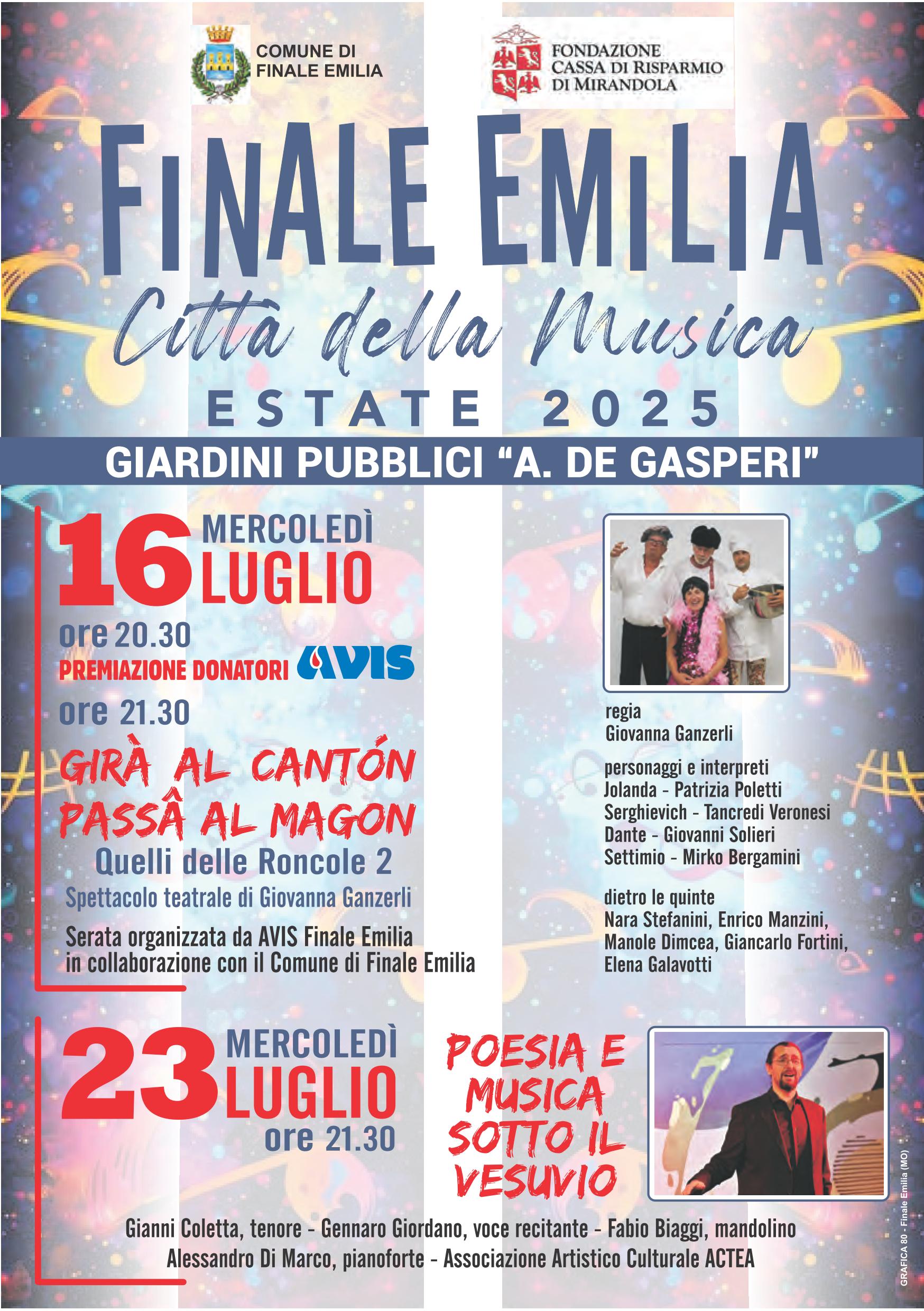 Mercoledì 23 luglio, alle 21.30, sarà protagonista Napoli con lo spettacolo, a cura dell’associazione artistico culturale Actea, “Poesia e musica sotto il Vesuvio” che vedrà esibirsi il tenore Gianni Colletta e i musicisti Fabio Biaggi (mandolino) e Alessandro Di Marco (pianoforte), accompagnati dalla voce recitante di Gennaro Giordano.