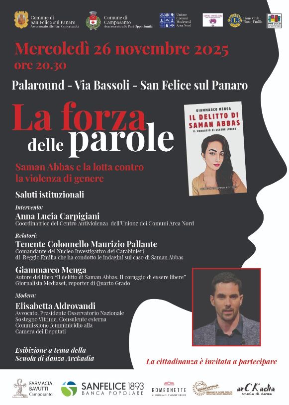 Il 26 novembre 2025, alle ore 20.30, il Palaround di San Felice sul Panaro (via Bassoli) ospiterà un importante evento dedicato alla lotta contro la violenza di genere: “La forza delle parole – Saman Abbas e la lotta contro la violenza di genere”.