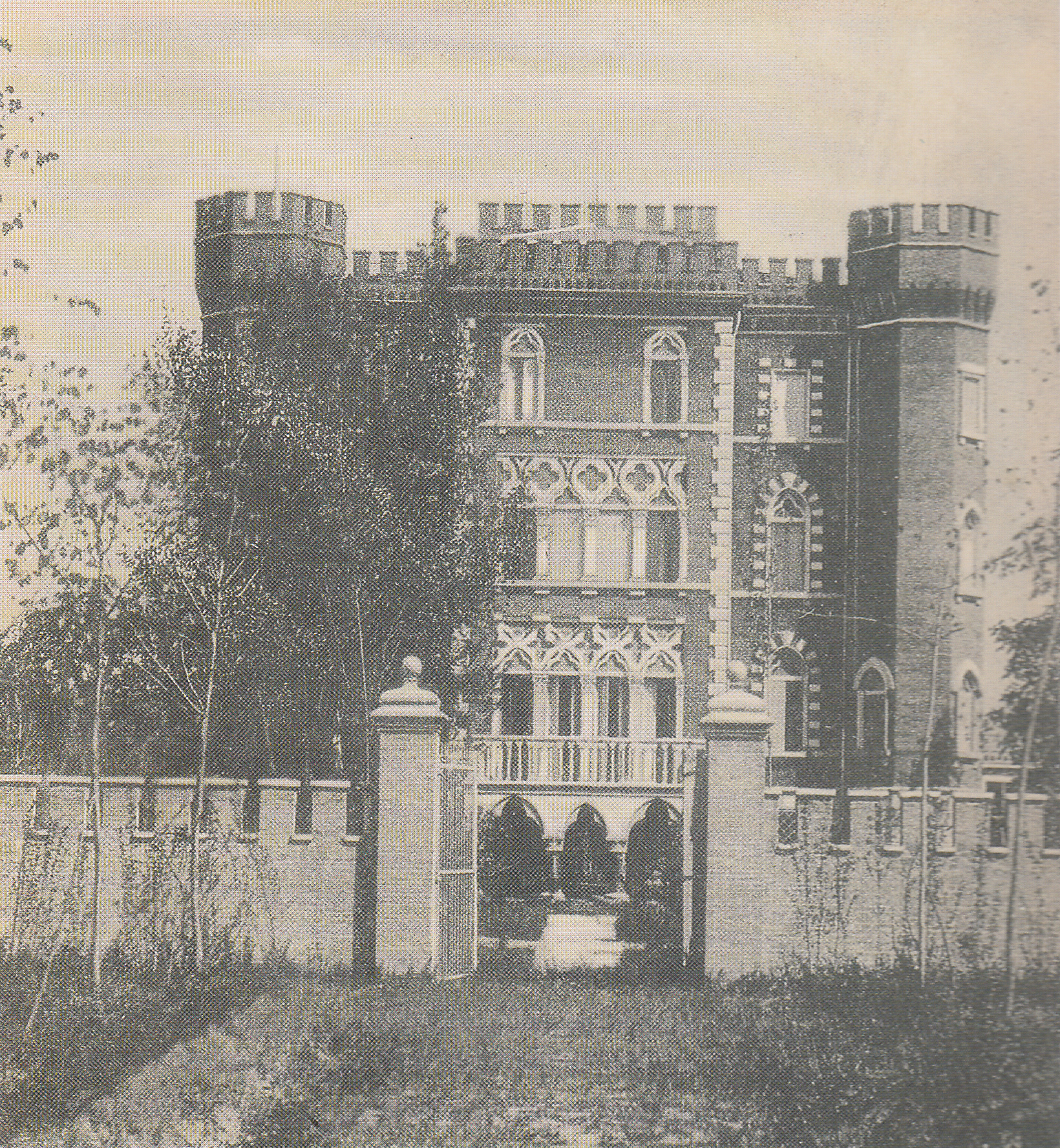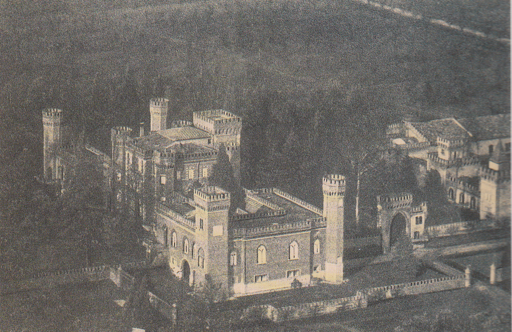 porte merlate di accesso. Nella seconda fase (1911-1914) l’aggiunta delle ali laterali, di una più ampia recinzione e dell’intero parco trasformò la fisionomia rigida e bloccata del primitivo maniero in un ambiente di grande valenza scenografica.