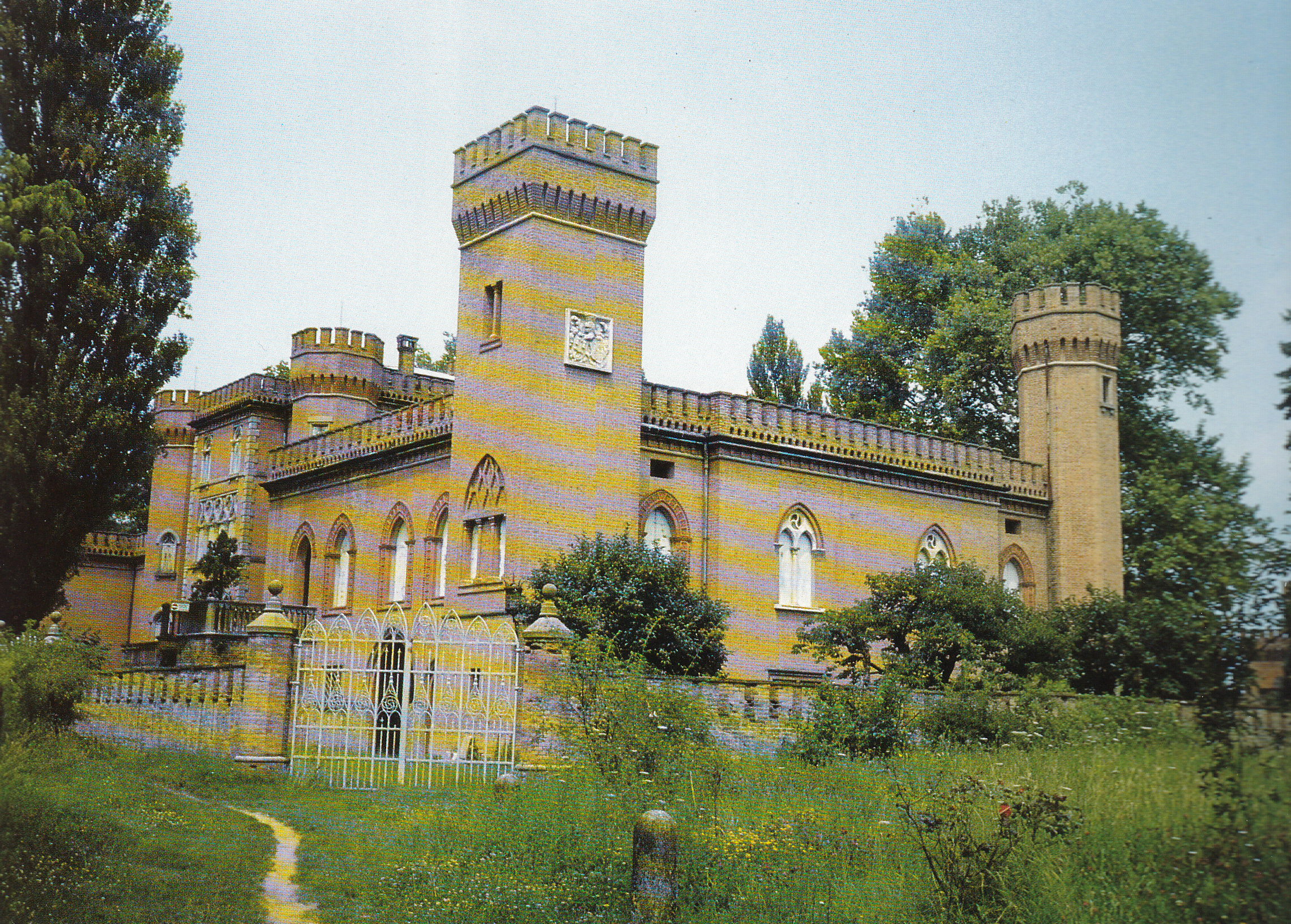Il modello fu il castello di Tobitschau, residenza boema dei nobili viennesi von Gutmann. Nella massiccia costruzione a tre piani dalle quattro torri angolari ottagonali e avancorpo più alto a guisa di mastio, le pareti murarie sono alleggerite dalla partitura regolare delle finestre ogivali e dalle decorazioni in pietra, cotto e cemento.