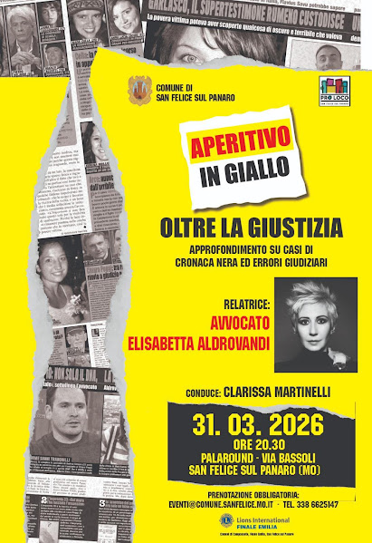 Appuntamento martedì 31 marzo a San Felice sul Panaro, Palaround di via Bassoli ore 20.30, con “Aperitivo in giallo: oltre la giustizia, approfondimento su casi di cronaca nera ed errori giudiziari”.