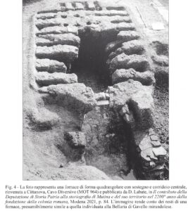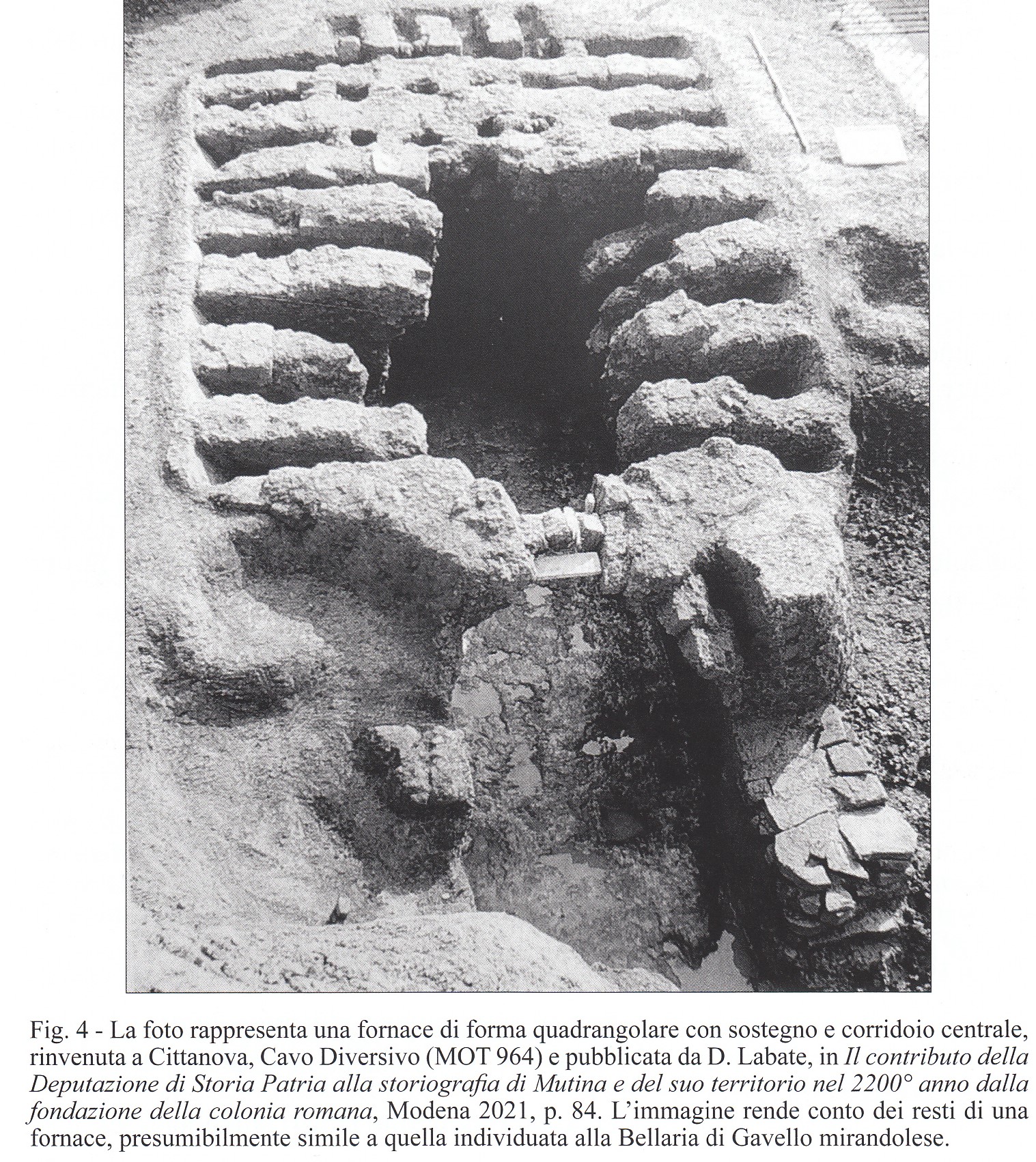 - In primo luogo il condotto idrico alimentava impianti produttivi (fornaci) per la cottura di fittili. Le fornaci rinvenute sono alla Bellaria di Gavello, alla Baia-Masetta di San Martino Spino, alla Badiletta presso Gavello ferrarese. Ma anche a Quarantoli si può ipotizzare che il sito romano, posto a levante dell’abside della Pieve, abbia ospitato una fornace, da collocare nella parte di insediamento non indagato dalla ricerca di superficie. Le fornaci anzidette sono state costruite, tutte, a ridosso della sponda nord del canale Gabellus, in sinistra del condotto, al fine di smaltire, verso la valle posta a nord del corso idrico, le acque di risulta delle vasche di decantazione dell’argilla.