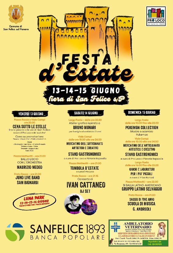 Si svolgerà a San Felice sul Panaro dal 13 al 15 giugno la Festa d’estate con tanti appuntamenti e il luna park in piazza Ettore Piva dal 13 al 16 giugno.
