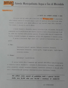 A Mirandola nel 1964 si decise di unificare i servizi pubblici dell’acqua e la stazione di pompaggio del metano privata della ditta toscana Lazzi, quella per intenderci sulla sinistra della SS12 all’uscita di Mirandola verso Verona, al Mulino della Rotonda che riempiva le bombole del gas degli automezzi, camion e auto. Questa fusione di servizi venne chiamata AMAG con sede nella casa colonica che si trovava appena fuori le mura (circonvallazione), dove ora sorge il centro commerciale CONAD con tanti altri esercizi.