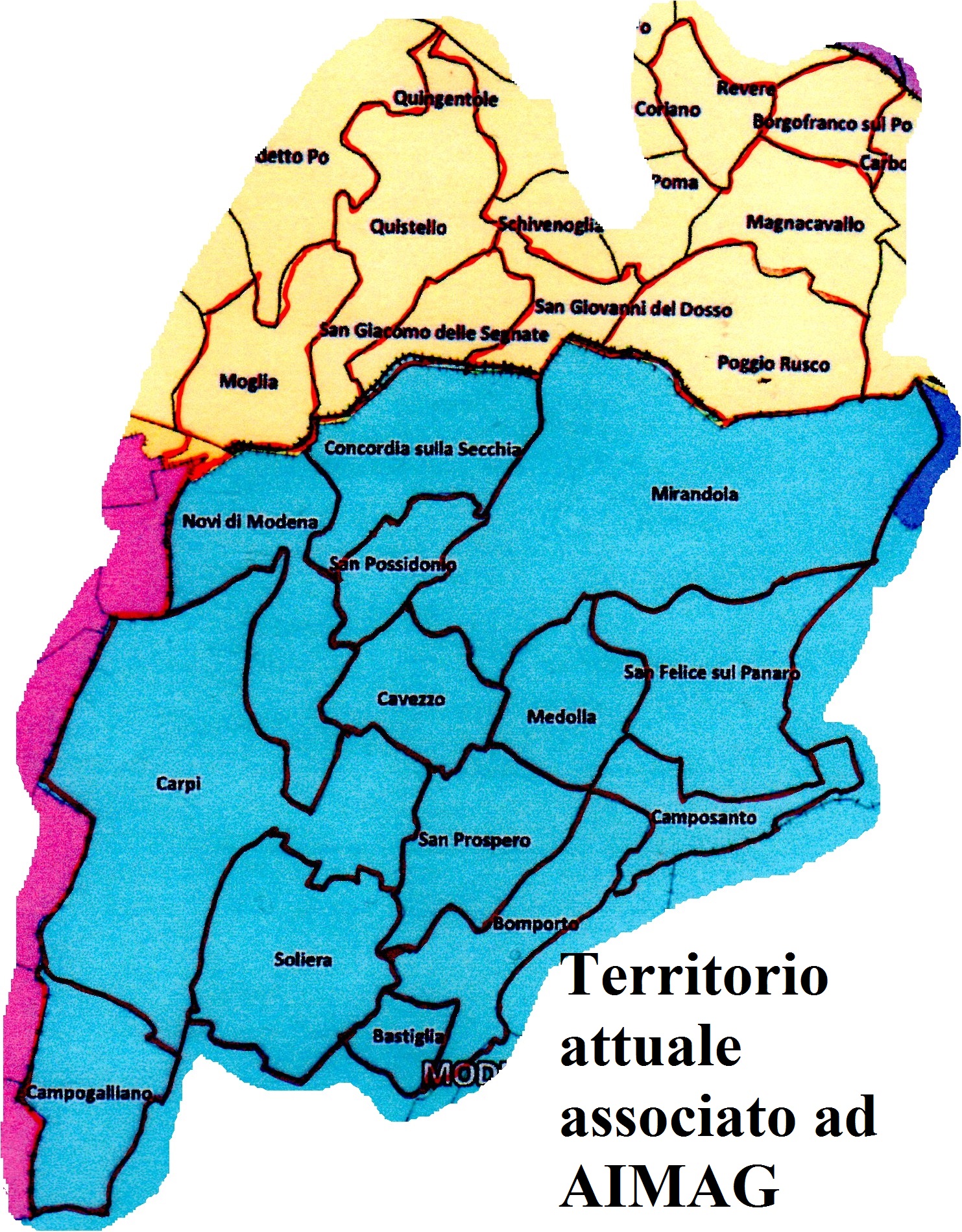 Il territorio attuale associato ad AIMAG è composto dai seguenti comuni: Bastiglia, Bomporto, Borgofranco,Campogalliano, Camposanto, Carpi, Cavezzo, Concordia, Medolla, Mirandola, Moglia, Novi, Poggio Rusco, Quistello, Revere, S. Felice s/P, S. Giacomo delle Segnate, San Giovanni Dosso, S. Prospero s/s, Soliera, per un totale di 212.964 abitanti