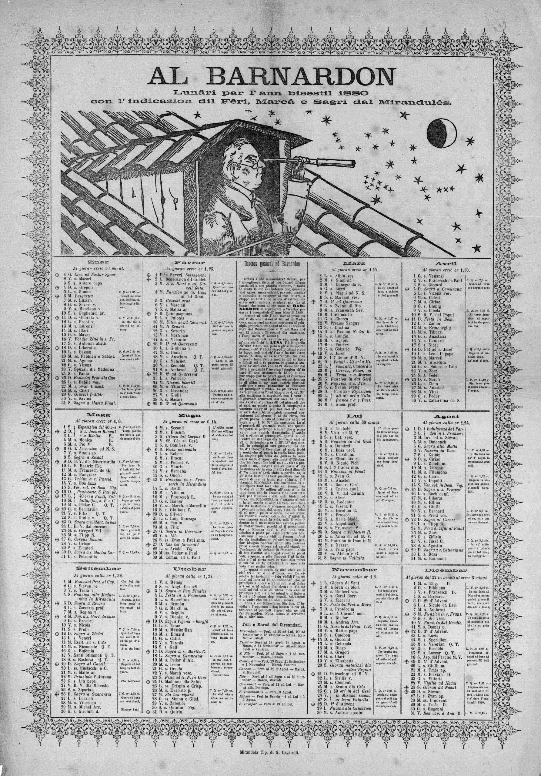 Sono proprio contento perché ho visto che lo comperano signori, “mezz calzett”, poveri, mezzadri e contadini. Per questo motivo ho preso tutto il mio materiale d’astronomia e mi sono messo subito a “strulgar” dal mio “luminarol” per preparare al meglio quello che riguarda l’anno bisestile. Dal mio nome ho pensato bene di chiamarlo “BARNARDON” e ve lo presento.
