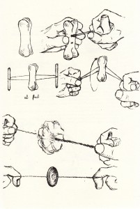 Per avviarlo si tenevano allentate le cordicelle imprimendo un moto rotatorio e quando erano attorcigliate, piano piano si tendevano: al frul al turnava indré attorcigliando le orde in senso contrario. Tirando in un senso e nell’altro, al frul l’andava.