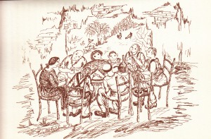 Ma, a proposit ad caplett, l’è sicura che i eran poch i mirandules che i magnavan spess. Almeno par qualchidun, a prevv essar interessant dar na piccola uciada a una relazion dal Cumun dla Mirandla su cum andava al robi in dla nostra campagna e cum a viviva i cuntaden a la fin dal secul passaa. La dis la relazion che i nostar cuntaden e i salariaa agricol ad la campagna “i magnan soprattutt dla gran pulenta, dal volti con un poch ad carna (ma poca) ad porch, oppure un qualch pess (rani e buccacci) o un poch ad furmaj, ma soprattutt con dla gran zivolla. E anch na qualch patacca, dal rizotti, di radett e dl’insalata. Però a gh’era un qualch mees dl’ann, dop la tibia e dop essar andaa a spigular, che i villan i magnan anch un po’ ad pan bianch. I bevan quasi sempar dal ven, però dimondi suttil, vale a dir dal ven dacquaa, dal turcion e dal puntalon. I stann in dal cà isoladi, che in genar i en pulidi, senza troppi bestii par cà. E l’era già un bel pass avanti rispett ai temp da na volta.
