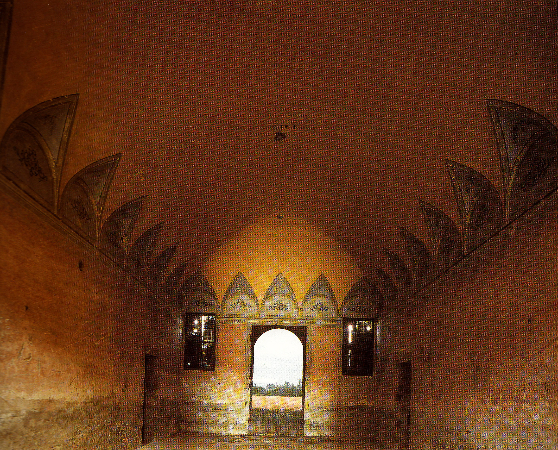 Il fabbricato fu poi unito al palazzo vero e proprio da una piccola corte interna cosi da formare un unico complesso. In origene, come attesta l’importante rilievo del1787, anche la torre era collegata ai corpi di fabbrica principali da un cortile chiuso: sorta di percorso riservato che dalle sale della villa conduceva fino alla torre fortificata. In seguito,agli edifici tuttora conservati, vennero addossate cucine, depositi e rimesse in buona parte poi demolite. Nonostante il degrado. e la perdita della decorazione originale, gli interni del palazzo, gravitanti attorno alla vasta sala-androne a volta lunettata, mantengono effetti di grande monumentalità.
