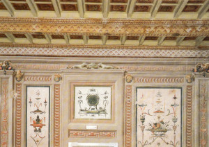 Abbiamo restaurato l’ appartamento dove si trovano le uniche due stanze rimaste ancora affrescate, con il terremoto l’ edificio è stato molto danneggiato e la stanza raffigurata sopra presentava diverse gravi lesioni.
