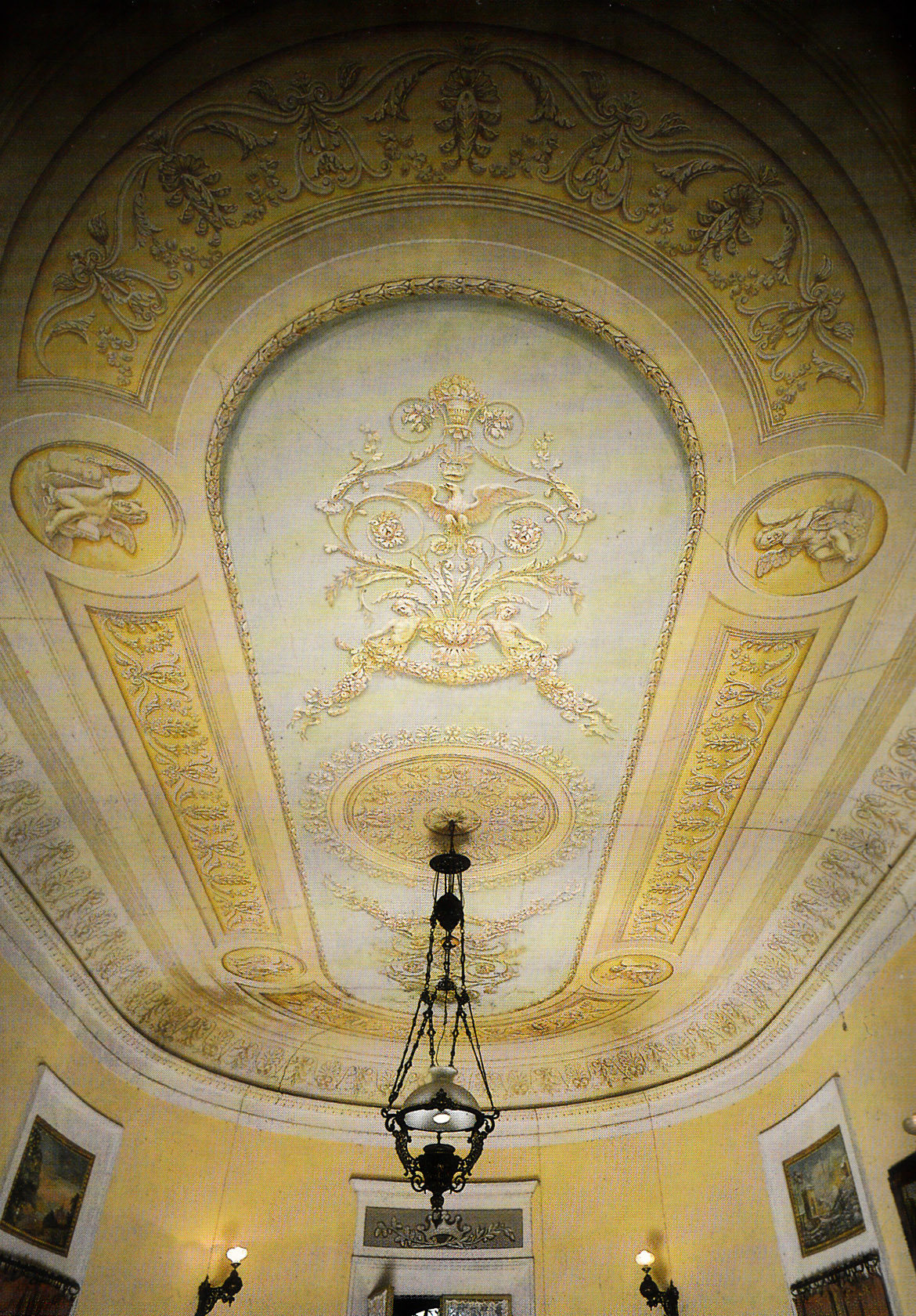 Stucchi lucidi, rilevati da «cornici da farsi in legno, che siano semplici», anche per le pareti dell’ambiente di rappresentanza, la Sala ovale, appena un po’ più ornata. Al soffitto, monocromi a grisaille su fondo ocra e verdino danno forma ai consueti repertori d’ornato — medaglioni, fregi, cartigli, volute… qui, come altrove nella Bassa, replicati da maestranze verosimilmente locali, spesso indifferentemente adibite alle funzioni di imbianchini o di decoratori. Come quel «pittore» Miglioli ricordato nei documenti della fabbrica che, incaricato di dipingere diversi ambienti — forse la stessa sala ovale — si offrì di eseguire anche i lavori di verniciatura dei ferramenti, interrotti per la morte di «certo Francesco Rizzi», pittore di San Felice. Precisi e dettagliati anche gli elenchi relativi alle «mobiglie, acquistate e fatte costruire per ordine di S.A.R. il Principe Ereditario», come detta la nota dell’archivio Parisi datata al 15 novembre 1842 (Modena, Archivio di Stato, Archivi Privati, Archivio Parisi b.1. Gran parte di tali arredi, realizzati espressamente per la fabbrica ducale, è stata alienata in anni recenti.