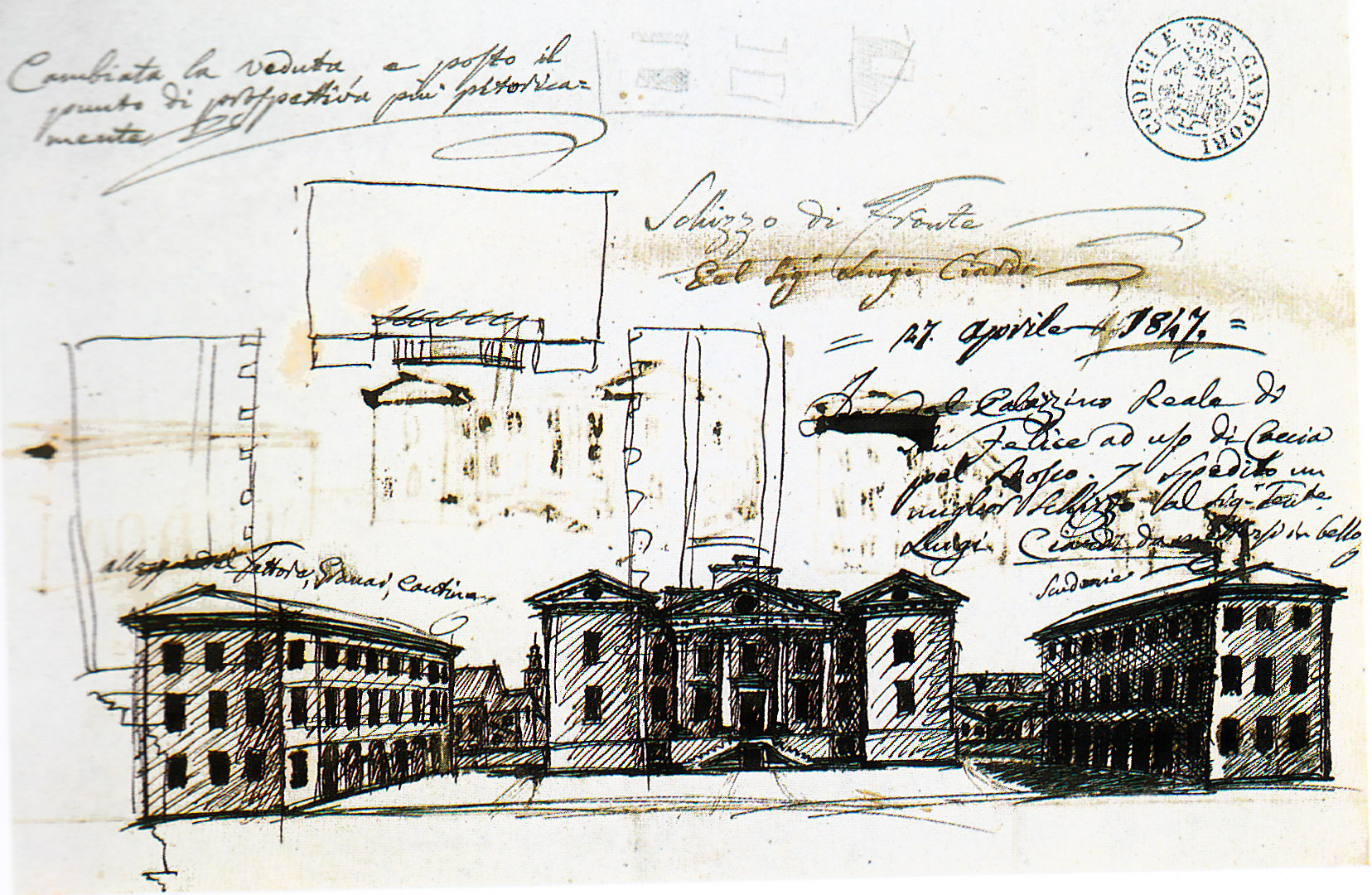 Numerose mappe tra il 1826 ed il 1827 riportano il complesso nell’assetto originario su cui si sovrappone il progetto della lunga provana in direzione sud, sulla quale avrebbe poi prospettato il fronte principale, rivolto pertanto non al paese, ma alla campagna, verso il Bosco, (Modena, Archivio di Stato,Acquisti 2300, Topografie 12; 14. Mappario Estense, Mappe del Genio Militare, Terreni 14). Un disegno del 1826 mostra già il futuro assetto della villa con la nuova ala di ponente simmetrica a quella preesistente e due fabbricati di servizio (scuderia ed alloggio del fattore), scenograficamente speculari, a far da quinta alla facciata del casino.