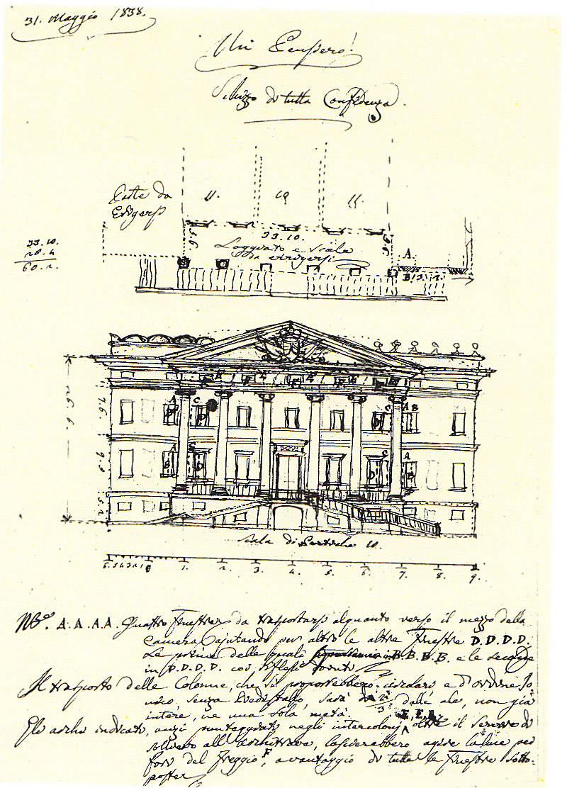 Dello stesso periodo sono alcuni progetti e due bozzetti per la soluzione della facciata, tutti conservati nell ‘archivio Parisi. Fra questi di particolare interesse lo schizzo richiesto dal Parisi a Giacinto Paltrinieri — noto maestro di disegno, cultore di storia locale e membro della Commissione di Ornato a Mirandola — che presenta un prospetto grandiosamente impostato su un’ampia loggia, coronata da un timpano retto da colonne ioniche. La soluzione, di effetto certamente più elegante dell’attuale, fu scartata a favore di un fronte tripartito con l’aggetto pronunciato delle ali laterali e con uno scalone più contenuto, ridisegnato una volta rifiutata anche l’ulteriore proposta a rampe semiellittiche.
