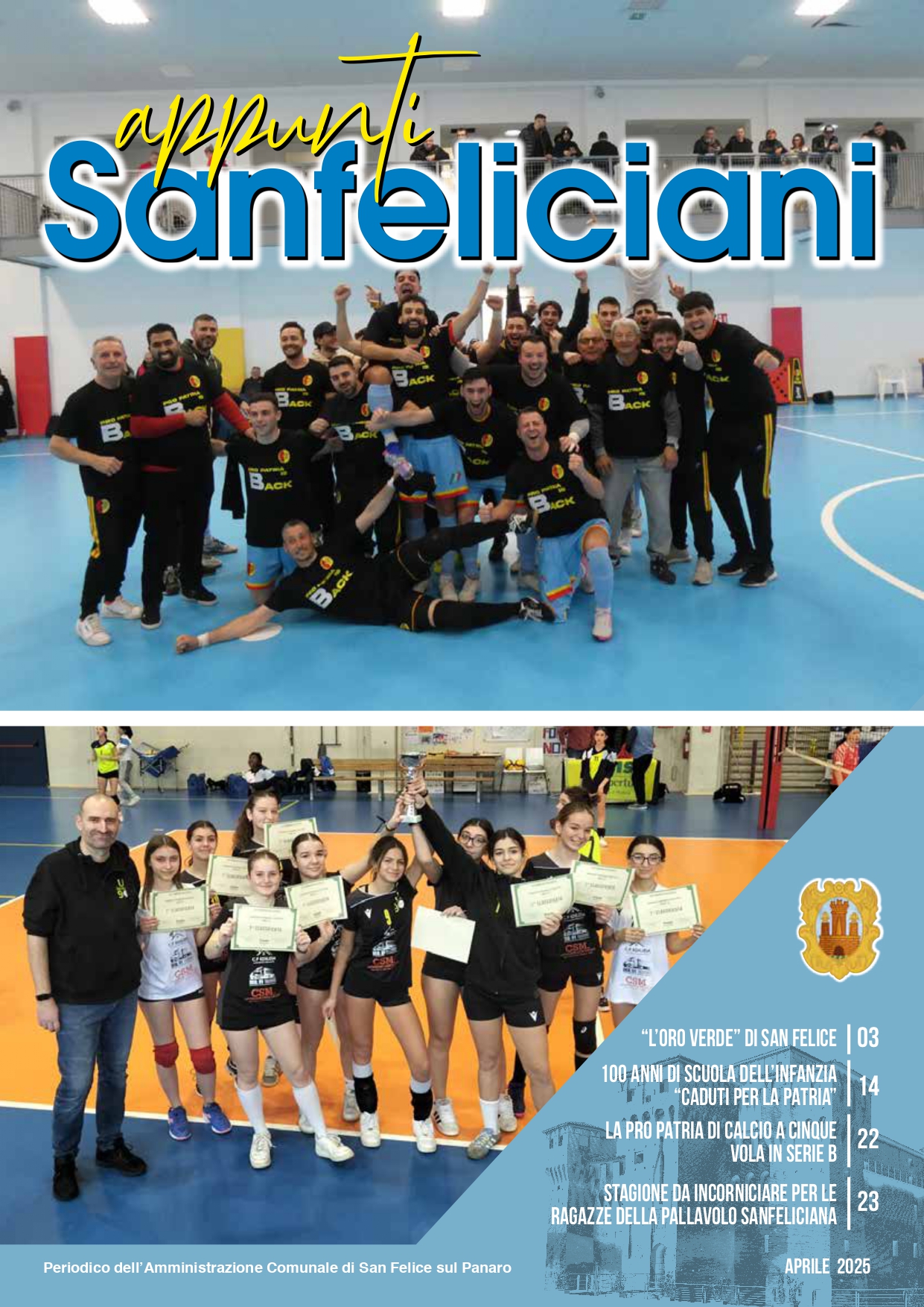 È in distribuzione il numero di aprile 2025 di “Appunti Sanfeliciani”, il periodico mensile del Comune di San Felice sul Panaro. In questo numero riflettori puntati sul verde cittadino, sulle iniziative per i 100 della scuola dell’infanzia “Caduti per la Patria” e sullo sport cittadino con i suoi recenti successi. Ma sono tanti altri gli articoli presenti sul periodico.