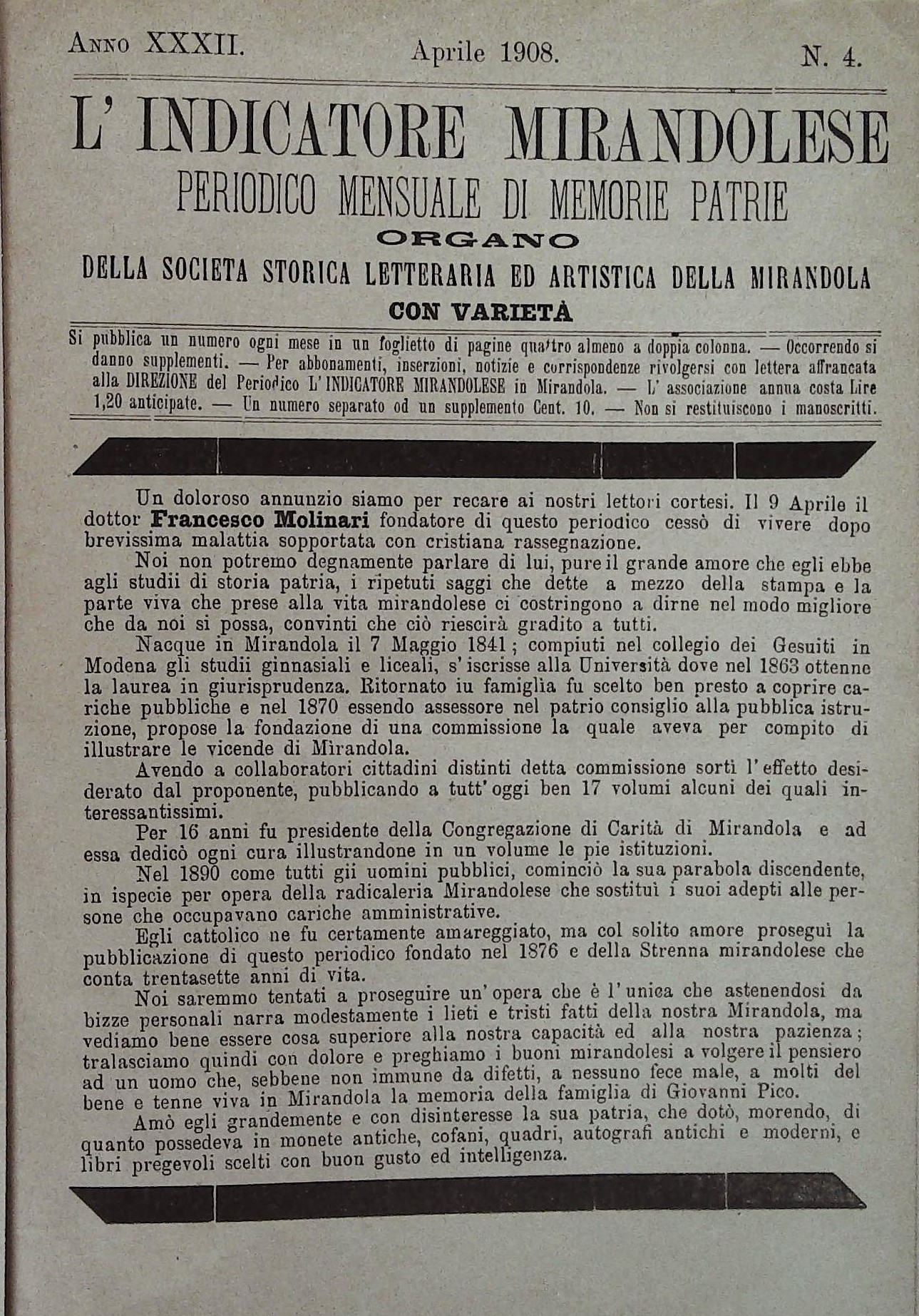 Aprile del 1908 – Con la morte del suo fondatore cessa l’attività “L’Indicatore Mirandolese”