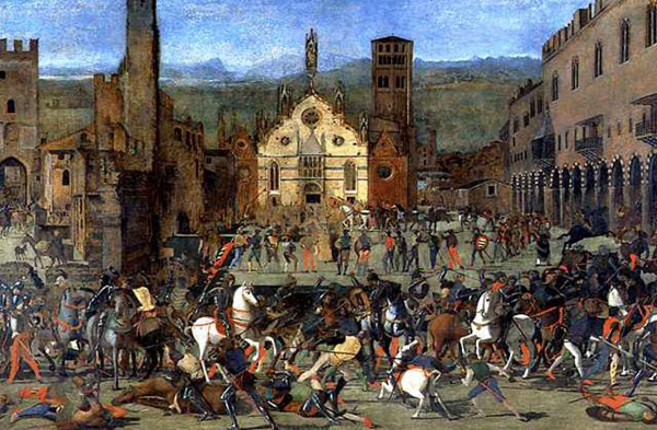 Quadro di Domenico Morone che raffigura l’uccisione del duca Bonaccolsi da parte di Nicolò Pico.