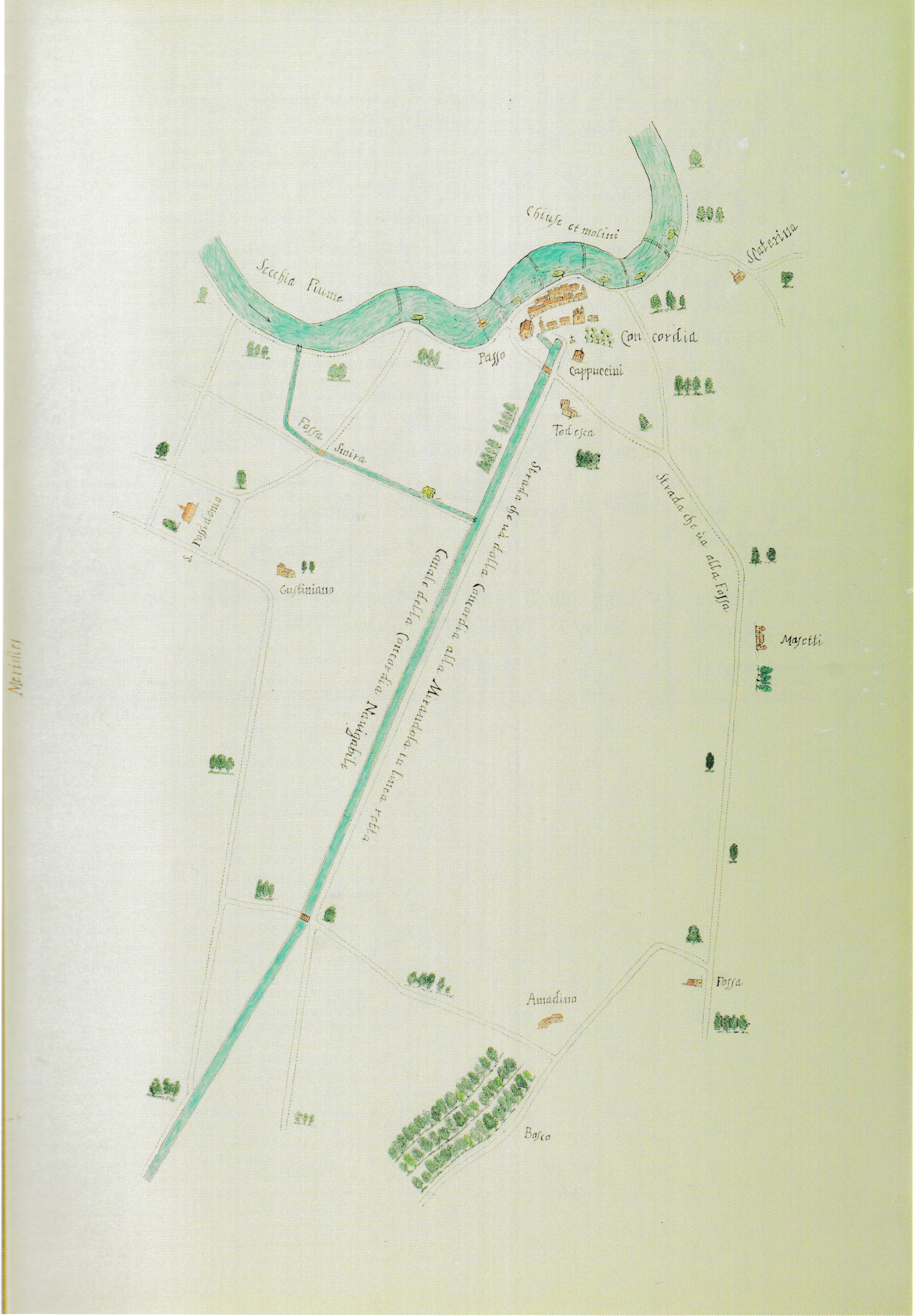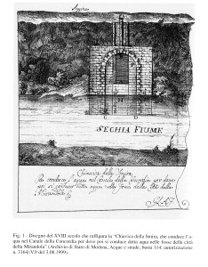 Un naviglio che congiungeva i due paesi ricavato dall’allargamento dell’antico canale che portava l’acqua del Secchia alle fosse che circondavano Mirandola, la Smirra, alimentato dal fiume attraverso una chiavica regolatrice a monte di Concordia.