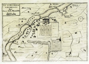Dal punto di imbarco di Mirandola presso il Rivellino, il baluardo esterno alle mura che difendeva la porta della città, si arrivava a Concordia, attrezzata con una banchina di sbarco e imbarco che si inoltrava nel paese perpendicolarmente al canale fin quasi al palazzo Corbelli. L’odierna via 1° Maggio nasce dal suo successivo interramento. Il livello del Secchia era troppo alto a Concordia per consentire un naviglio in diretta comunicazione con il fiume, dall’imbarcadero si trasbordava perciò al porto fluviale, all’altezza dell’attuale ponte per Novi.