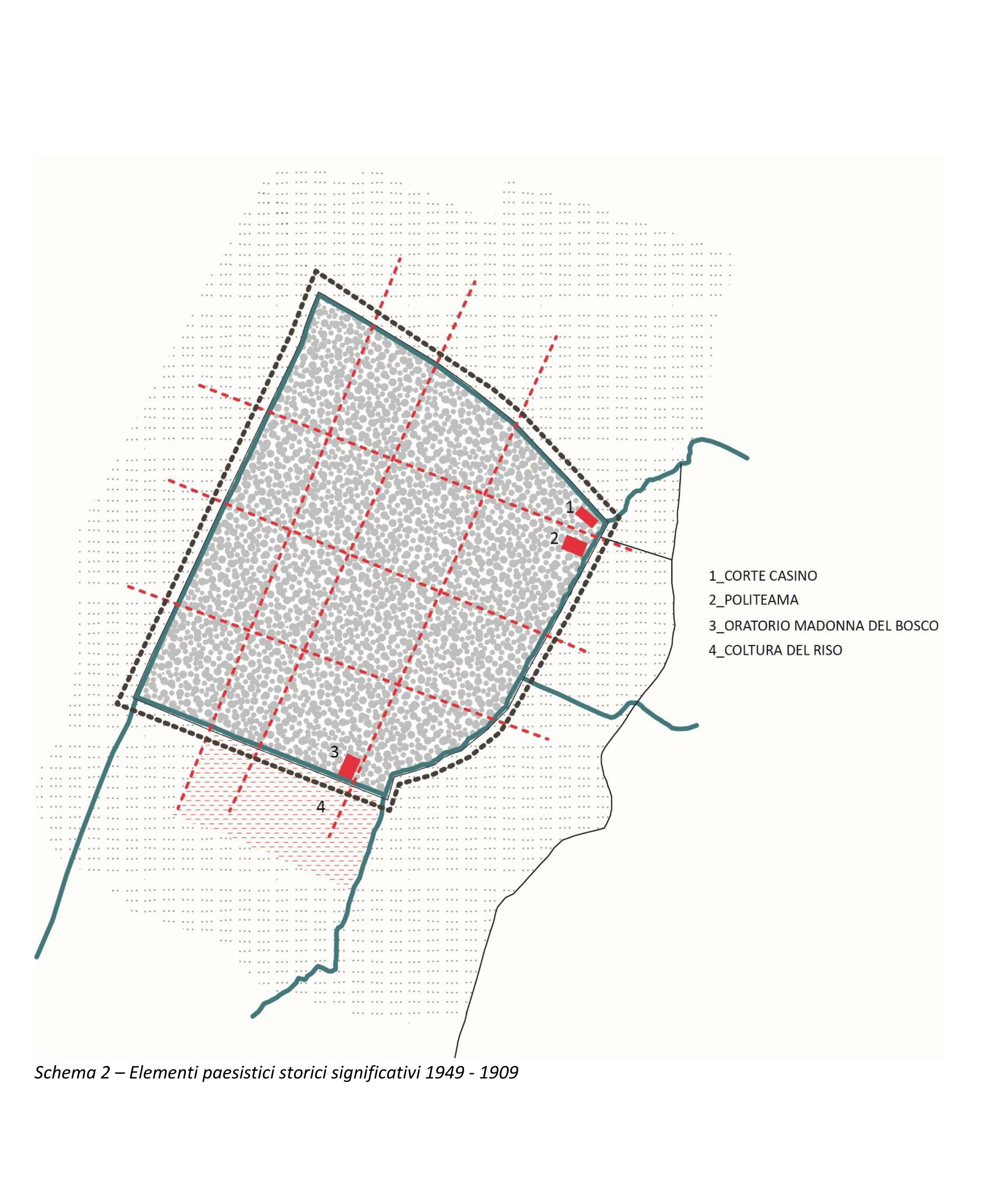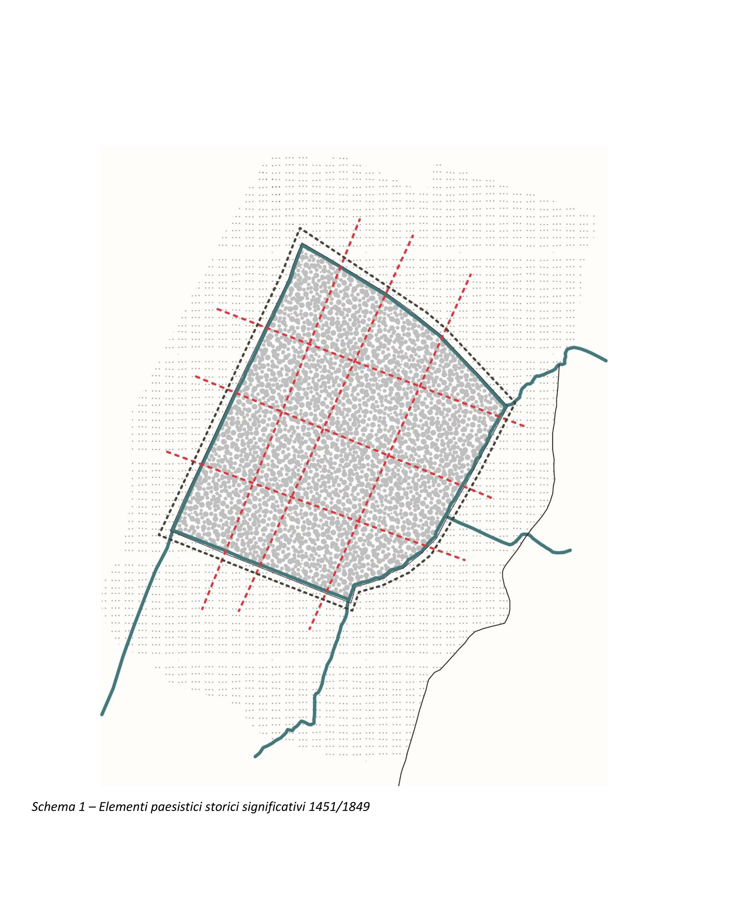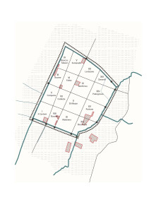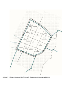 La tenuta venne suddivisa in 16 quadre di egual superficie, o circa, disponendo la costruzione di tre strade nord-sud e tre est-ovest.