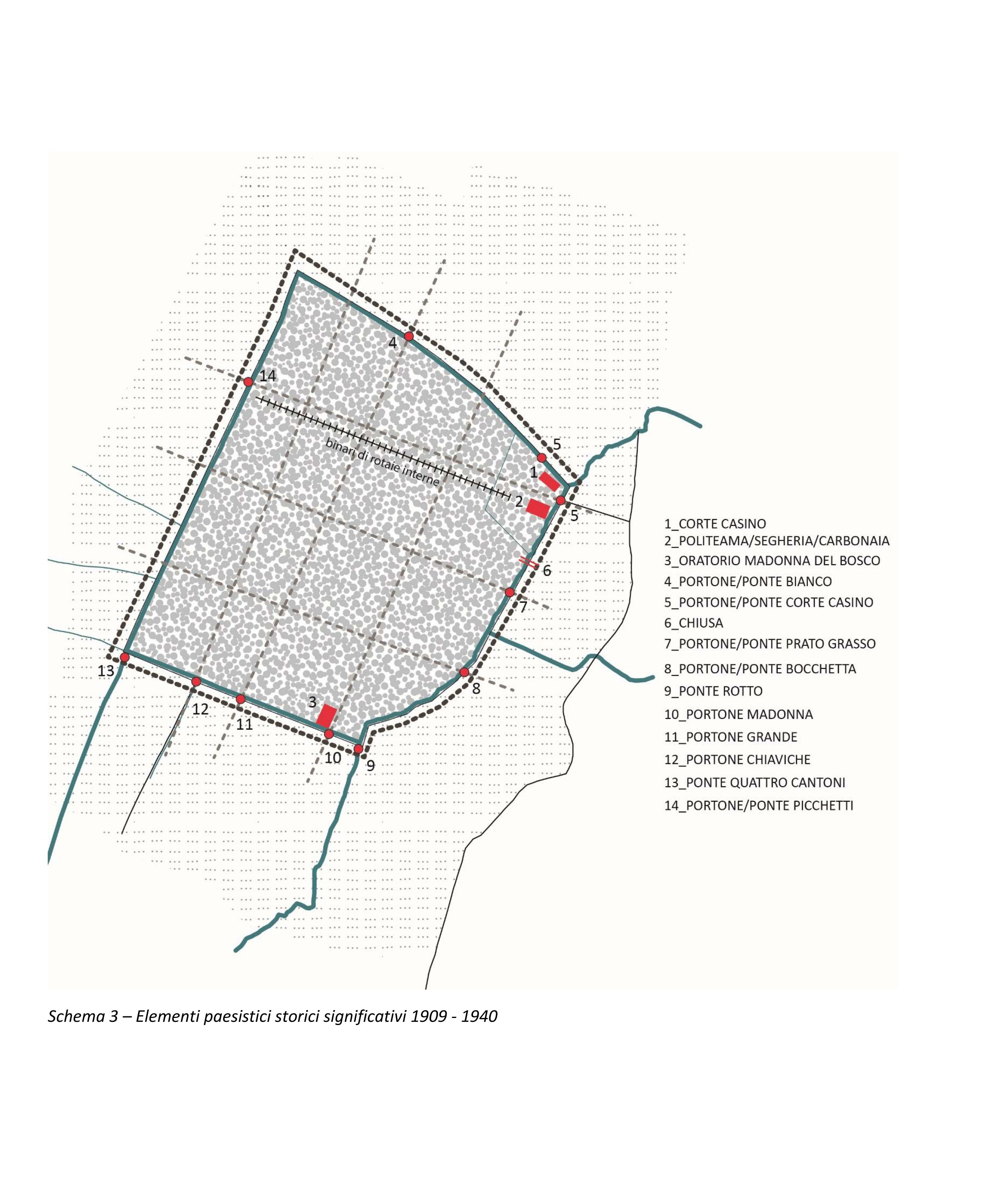 – All’esterno diffusa era la coltura della melonia (coltura poi ripresa a seguito del disboscamento). – Portoni di ingresso, posti al suo limite meridionale ed occidentale, formati da grossi cancelli in ferro sostenuti da pilastri in muratura. Il portone delle Chiaviche (n. 12 nello schema grafico 3) fu chiamato così perché lì vicino si distribuivano le acque del Bosco mediante paratie e chiaviche, appunto.