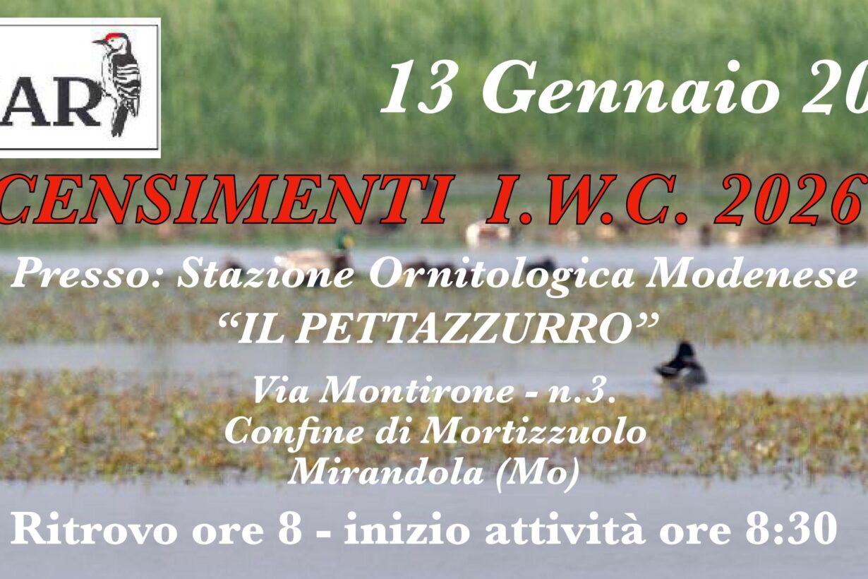 MARTEDI' 13 GENNAIO 2026 con ritrovo alle ORE 08:00 e inizio attività alle ORE 08:30 presso la Stazione Ornitologica Modenese in via Montirone 3, Località Confine di Mortizzuolo - Mirandola (MO) Si tratta dell'International Waterbird Census che viene svolto in contemporanea in quasi tutto il territorio europeo. I.W.C. è un monitoraggio annuale ed internazionale degli...