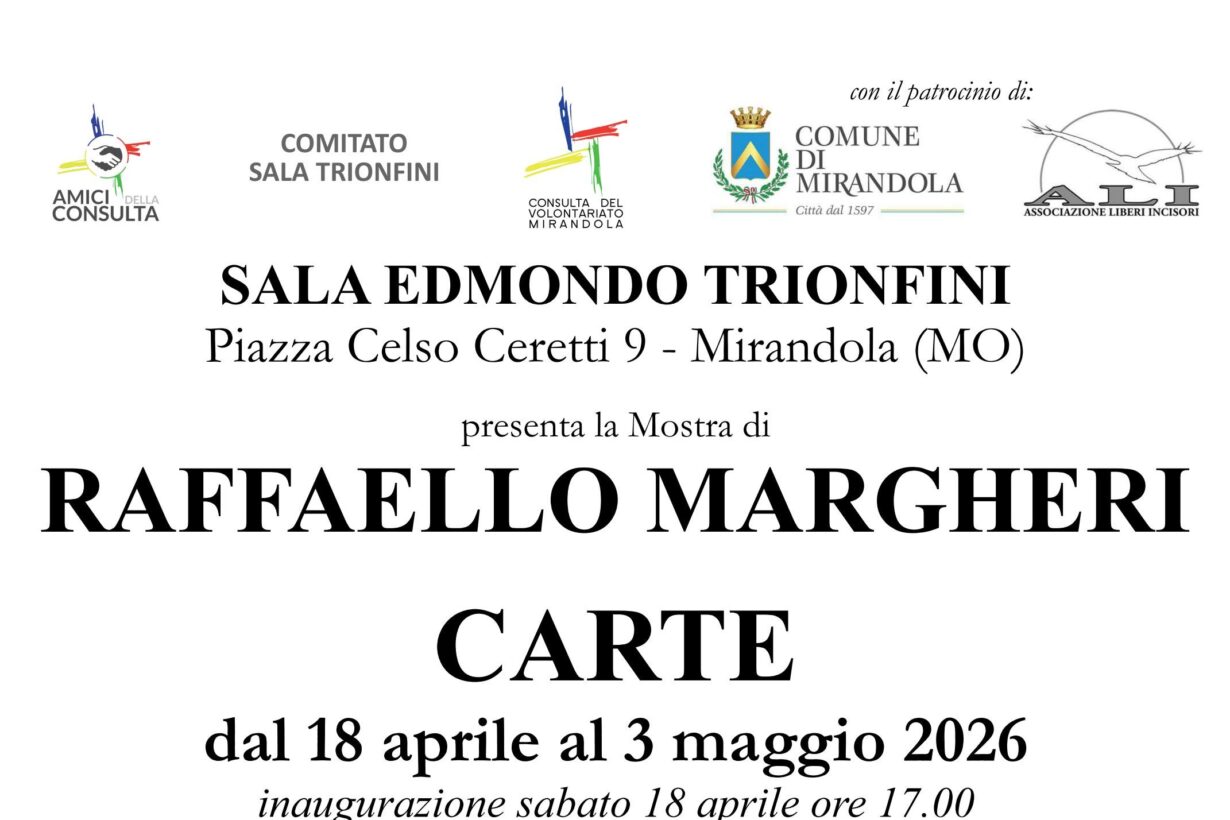 L’Associazione Amici della Consulta, il Comitato Sala Trionfini e la Consulta del Volontariato organizzano, dal 18 aprile al 3 maggio 2026, presso la Sala Edmondo Trionfini in Piazza Celso Ceretti n. 9 a Mirandola, la Mostra “Carte” dell’incisore Raffaello Margheri. L’inaugurazione è prevista sabato 18 aprile alle 17. La mostra, a ingresso libero, si tiene con [...]