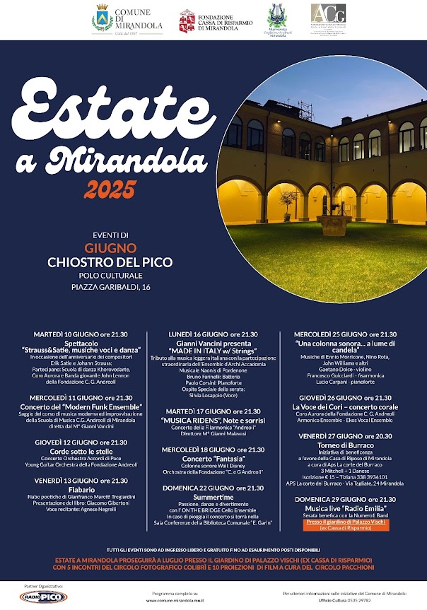 Nel mese di giugno, il Chiostro del Polo Culturale “Il Pico” ospiterà 11 serate tra musica, danza, teatro e letteratura. Il Festival della Musica sarà il cuore pulsante di questo primo mese, con una programmazione che spazia dalla musica classica a quella moderna, dalla canzone d’autore alla coralità, senza tralasciare momenti di socialità e riflessione culturale.